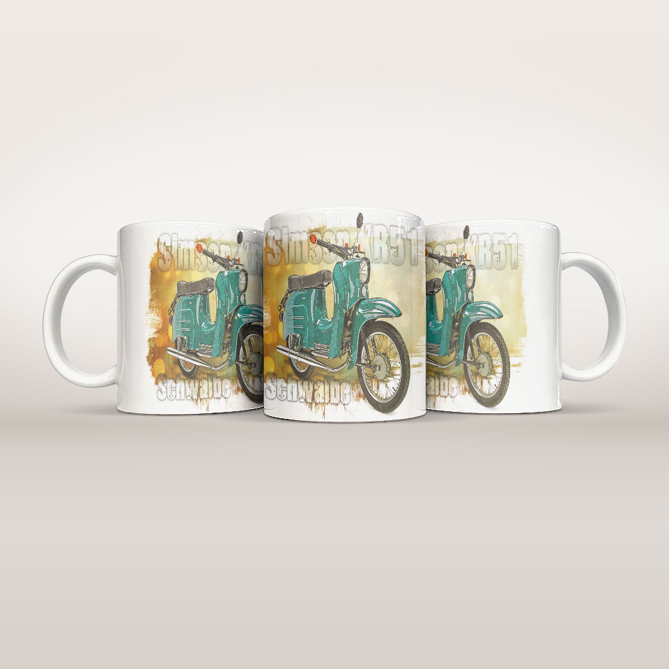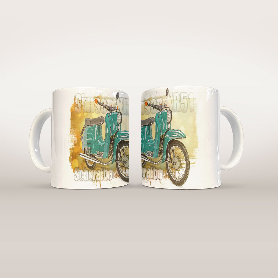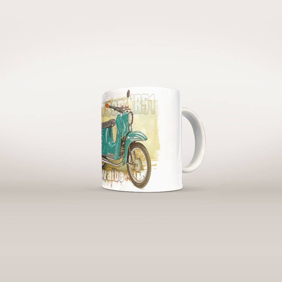 Ceramiczny kubek dla prawdziwego fana motoryzacji! Wyjątkowy nadruk inspirowany światem samochodów sprawi, że każdy łyk ulubionego napoju nabierze prędkości. Solidne wykonanie i nowoczesny design czynią go idealnym dodatkiem do codziennych chwil relaksu, zarówno w domu, w biurze, w warsztacie czy garażu. Świetny pomysł na prezent dla pasjonatów aut! Grafika przedstawia motorower Simson KR51 Schwalbe