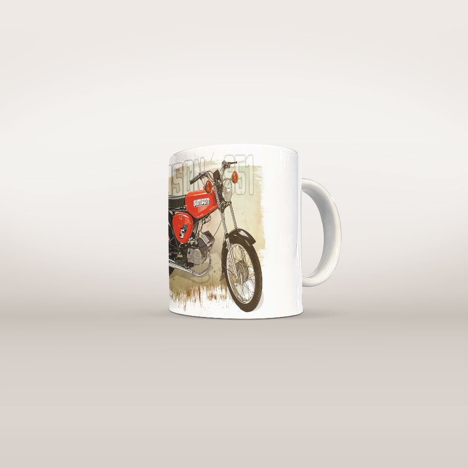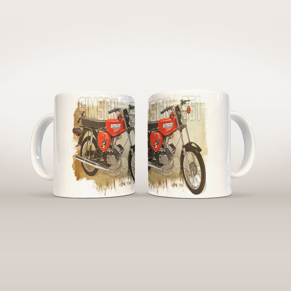 Ceramiczny kubek dla prawdziwego fana motoryzacji! Wyjątkowy nadruk inspirowany światem samochodów sprawi, że każdy łyk ulubionego napoju nabierze prędkości. Solidne wykonanie i nowoczesny design czynią go idealnym dodatkiem do codziennych chwil relaksu, zarówno w domu, w biurze, w warsztacie czy garażu. Świetny pomysł na prezent dla pasjonatów aut! Grafika przedstawia motorower Simson S51