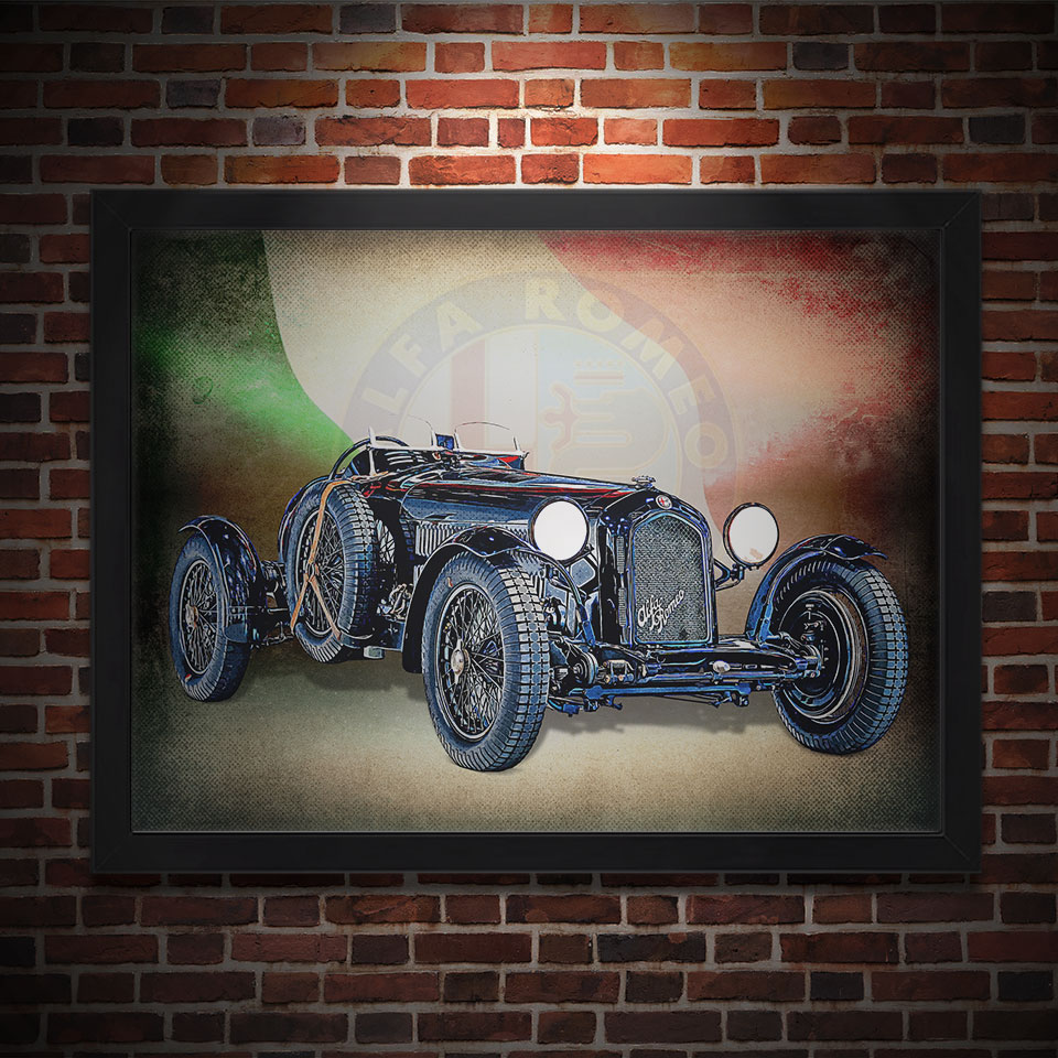 Obraz z naszą autorską grafiką w stylu retro, przedstawiający samochód Alfa Romeo 8C.