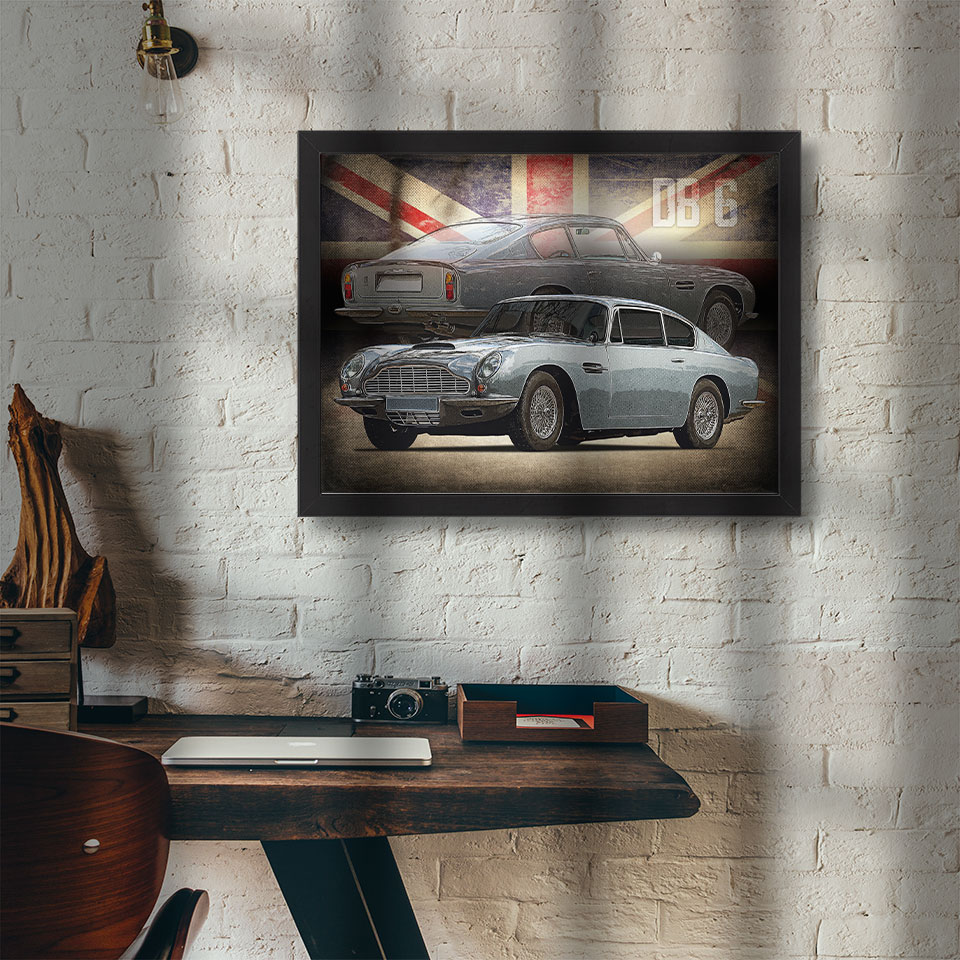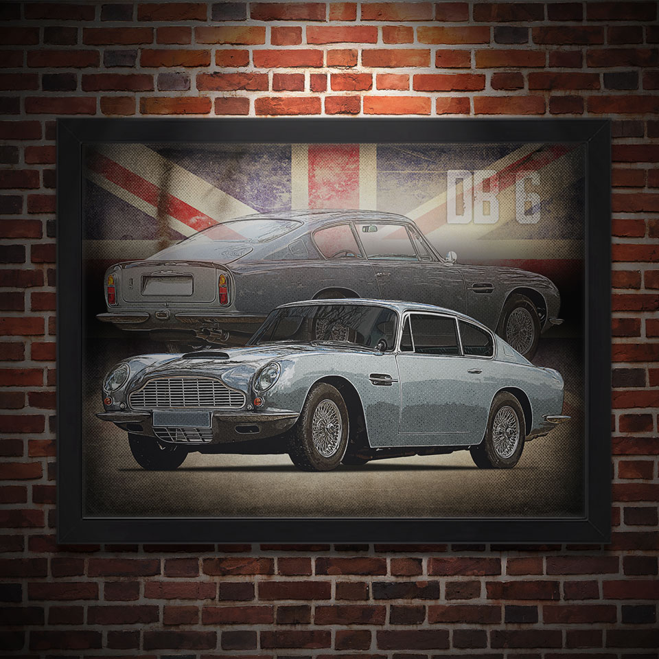 Obraz z naszą autorską grafiką w stylu retro, przedstawiający samochód Aston Martin DB6
