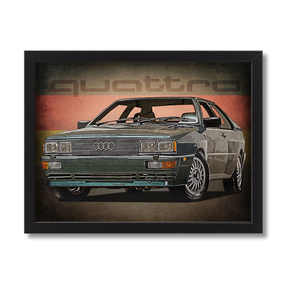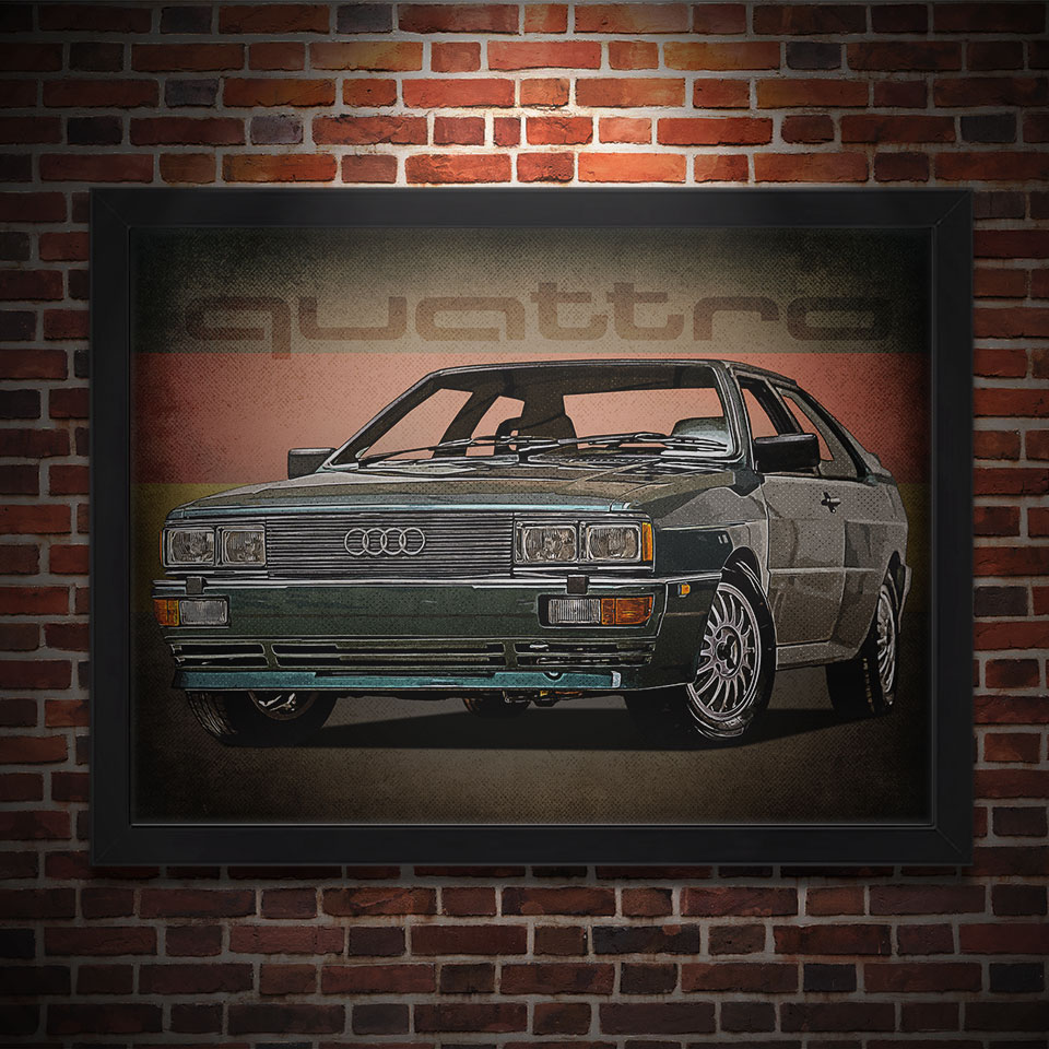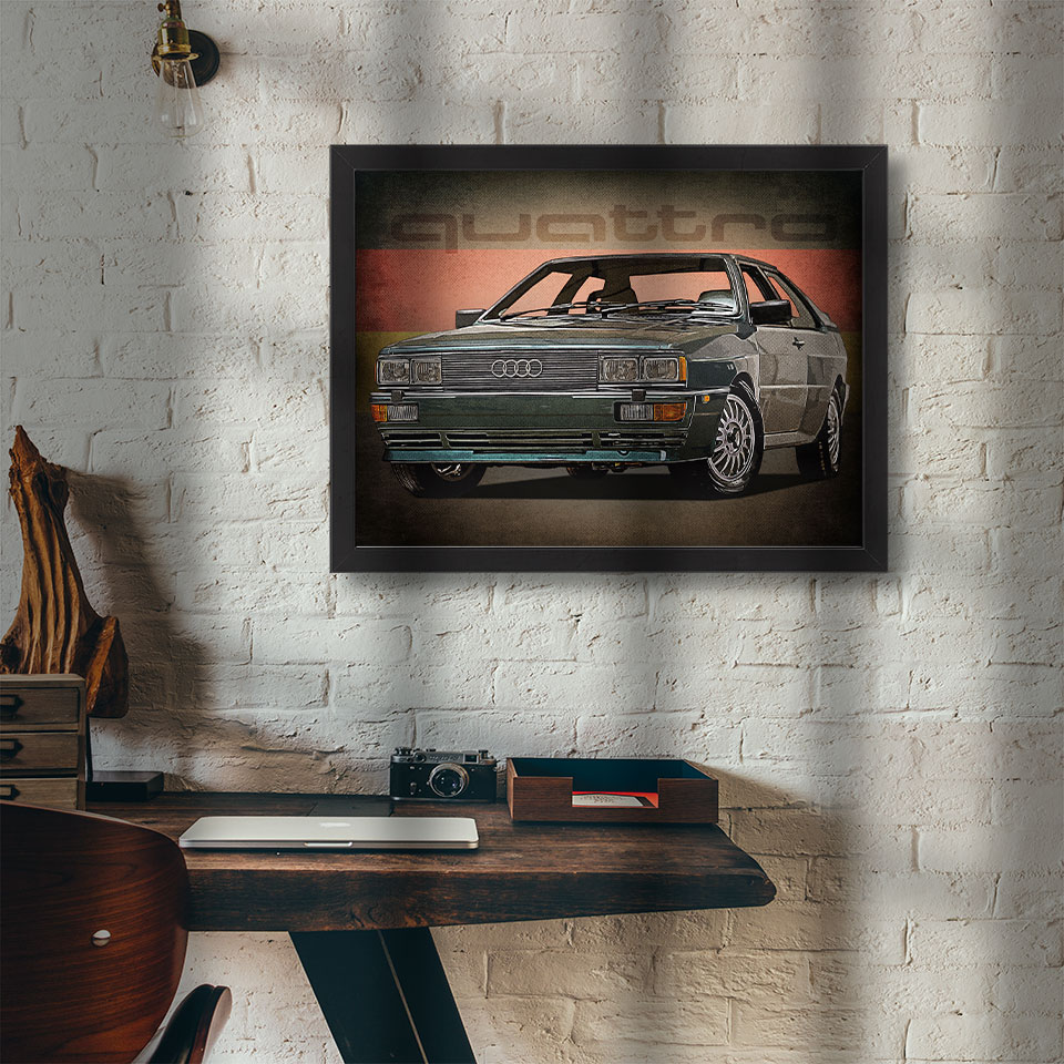Obraz z naszą autorską grafiką w stylu retro, przedstawiający samochód Audi Quattro