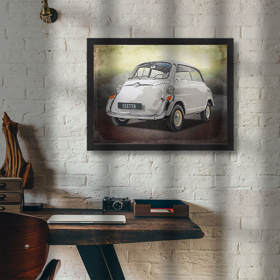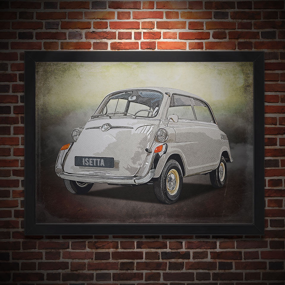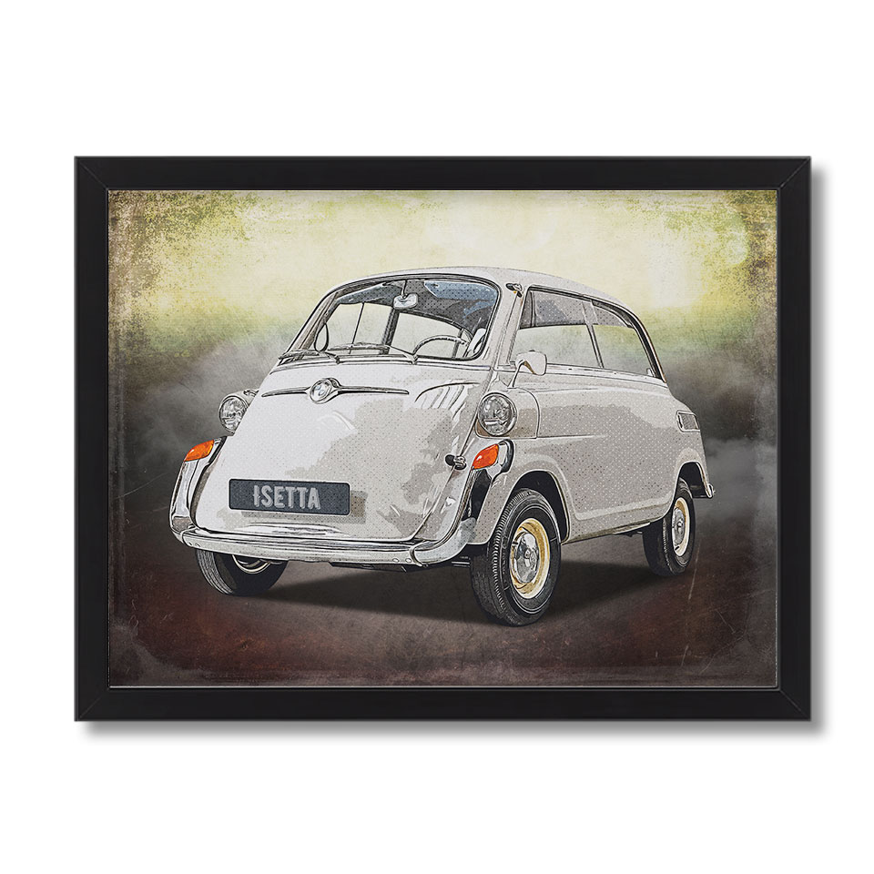 Obraz z naszą autorską grafiką w stylu retro, przedstawiający samochód BMW 600 Isetta