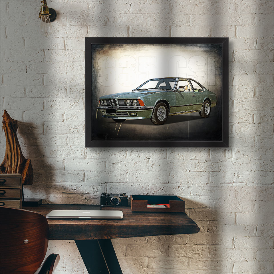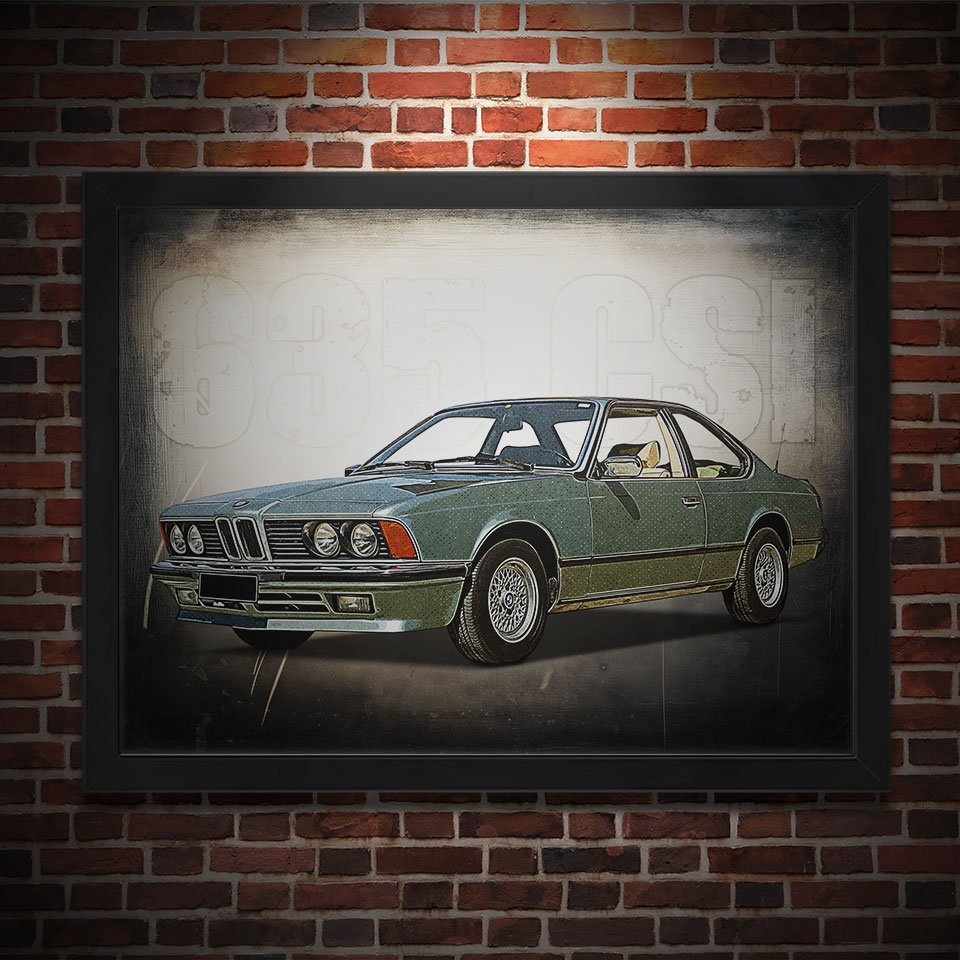 Obraz z naszą autorską grafiką w stylu retro, przedstawiający samochód BMW 635 CSI