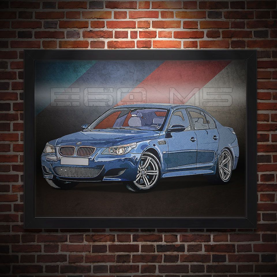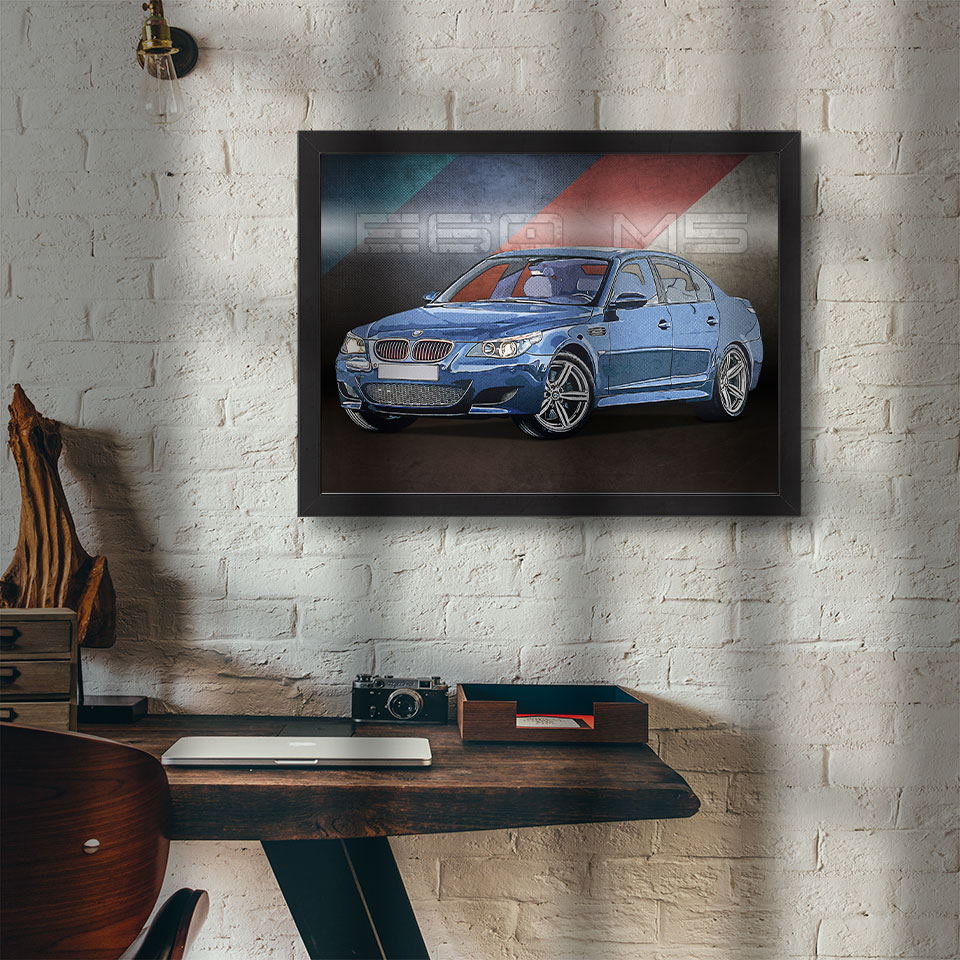 Obraz z naszą autorską grafiką w stylu retro, przedstawiający samochód BMW E60 M5