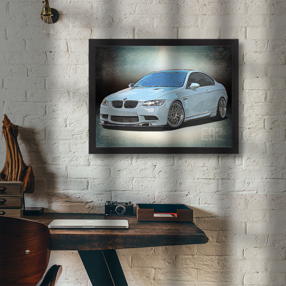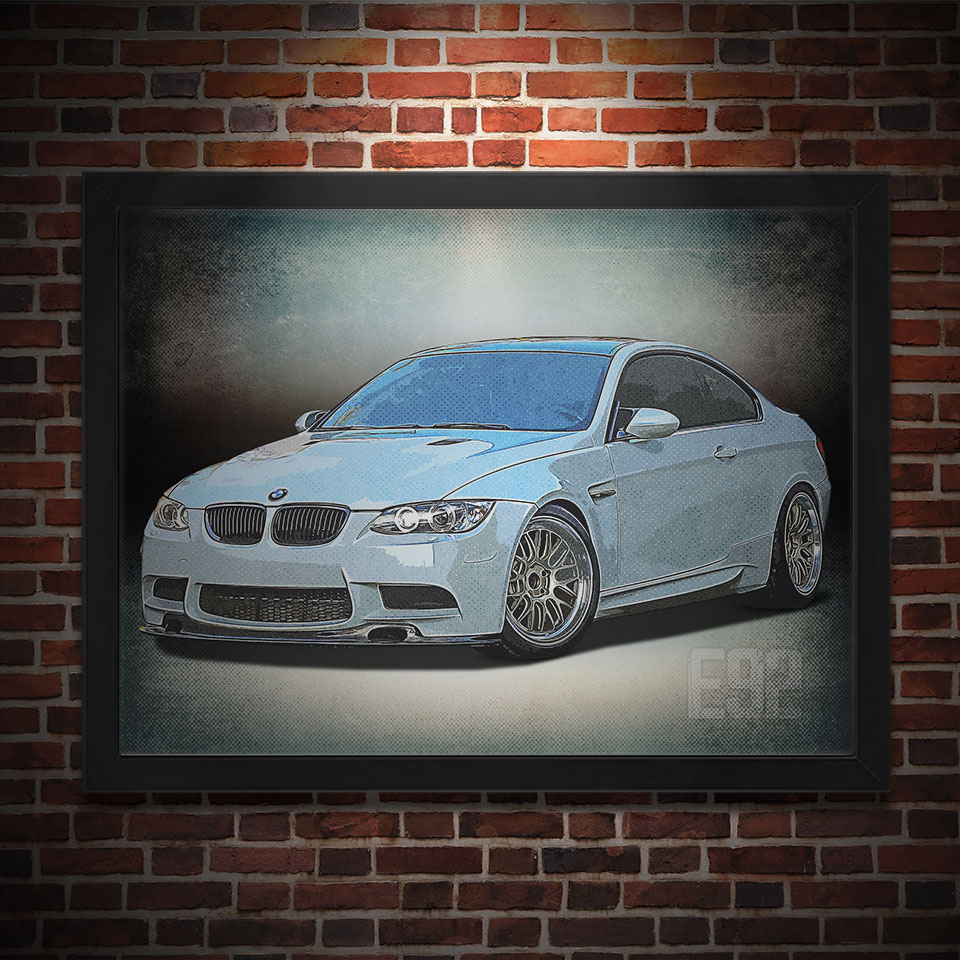 Obraz z naszą autorską grafiką w stylu retro, przedstawiający samochód BMW E92