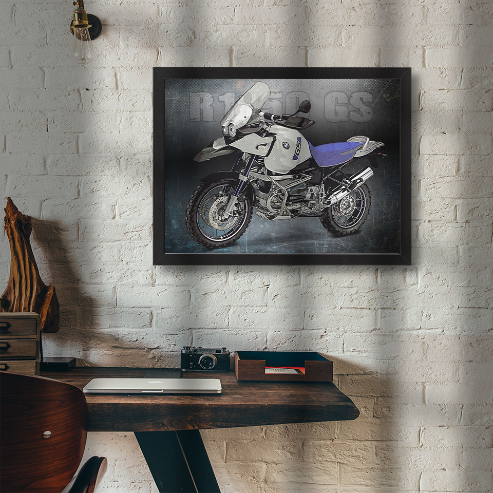 Obraz z naszą autorską grafiką w stylu retro, przedstawiający motocykl marki BMW R1150 GS