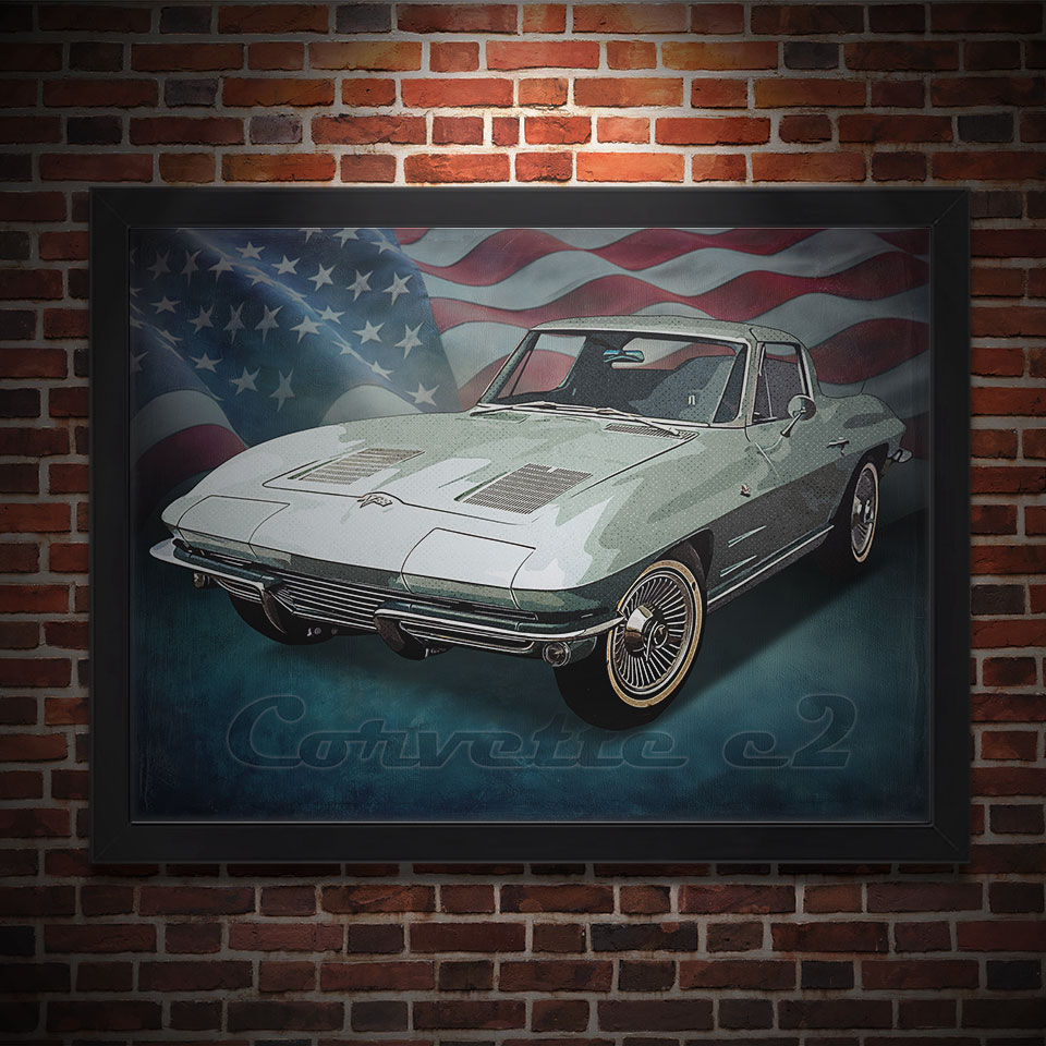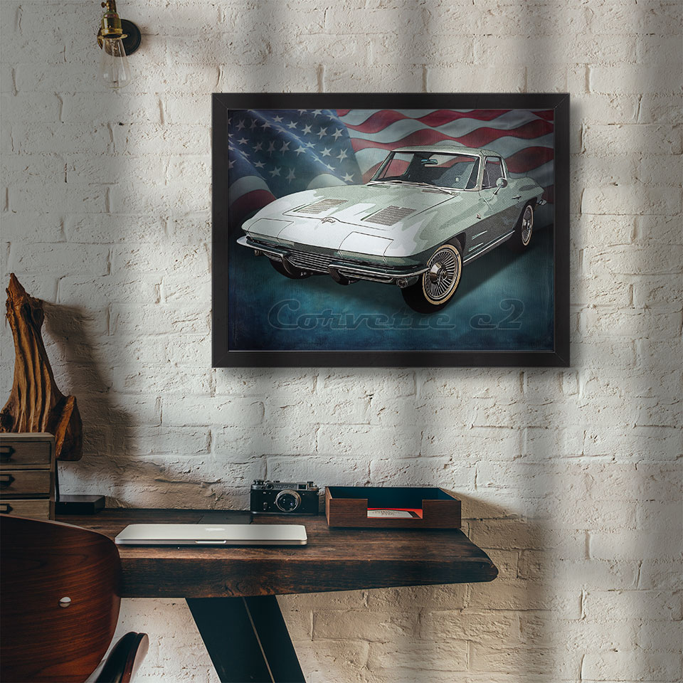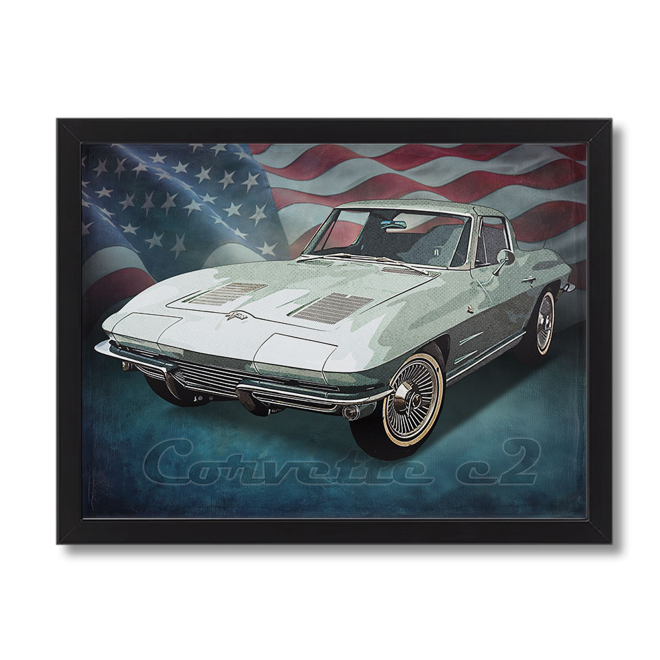 Obraz z naszą autorską grafiką w stylu retro, przedstawiający klasyczny samochód marki Chevrolet Corvette C2