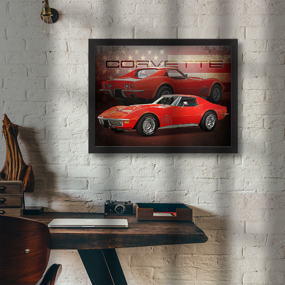 Obraz z naszą autorską grafiką w stylu retro, przedstawiający klasyczny samochód marki Chevrolet Corvette C3