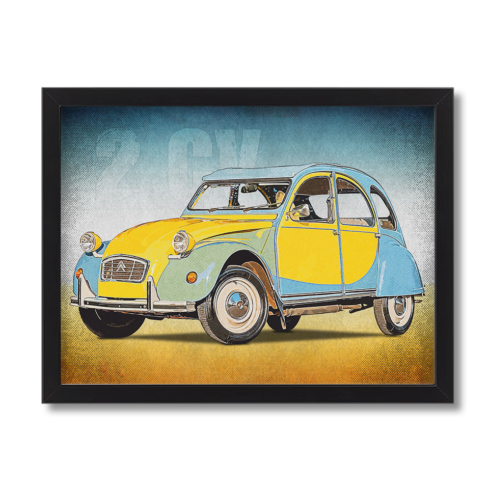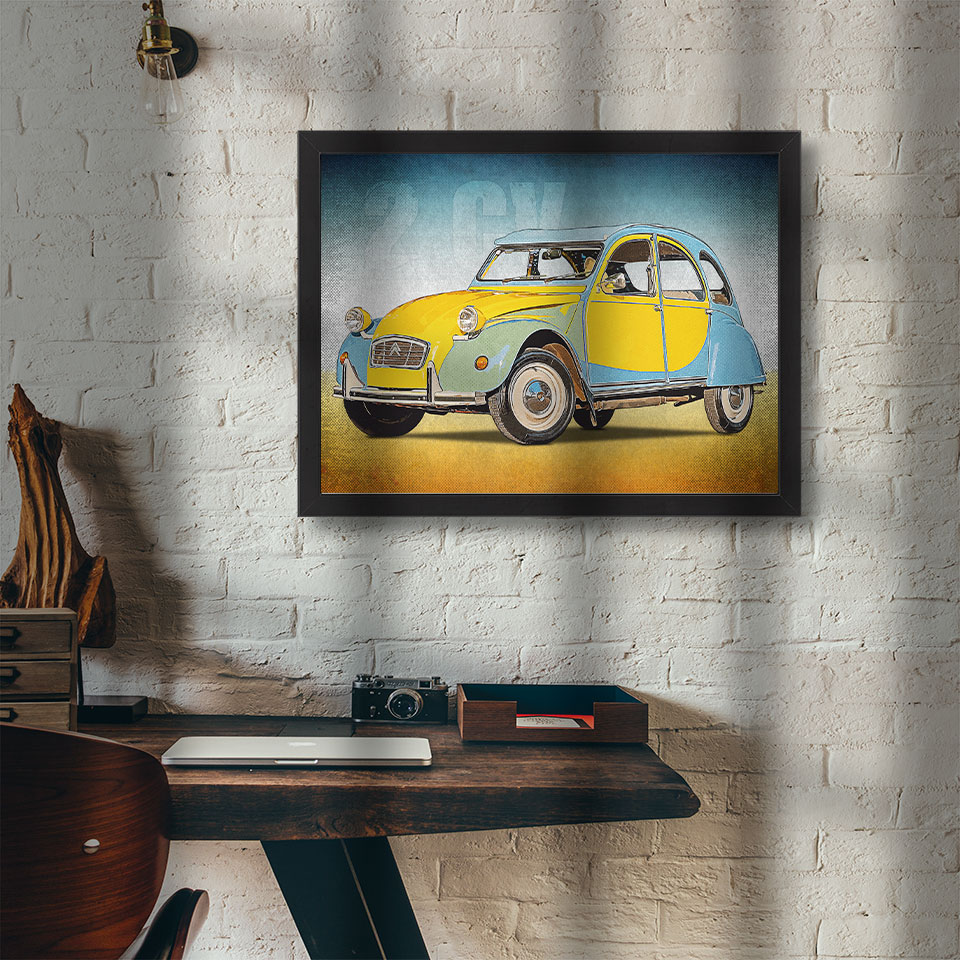 Obraz z naszą autorską grafiką w stylu retro, przedstawiający klasyczny samochód marki Citroen 2CV