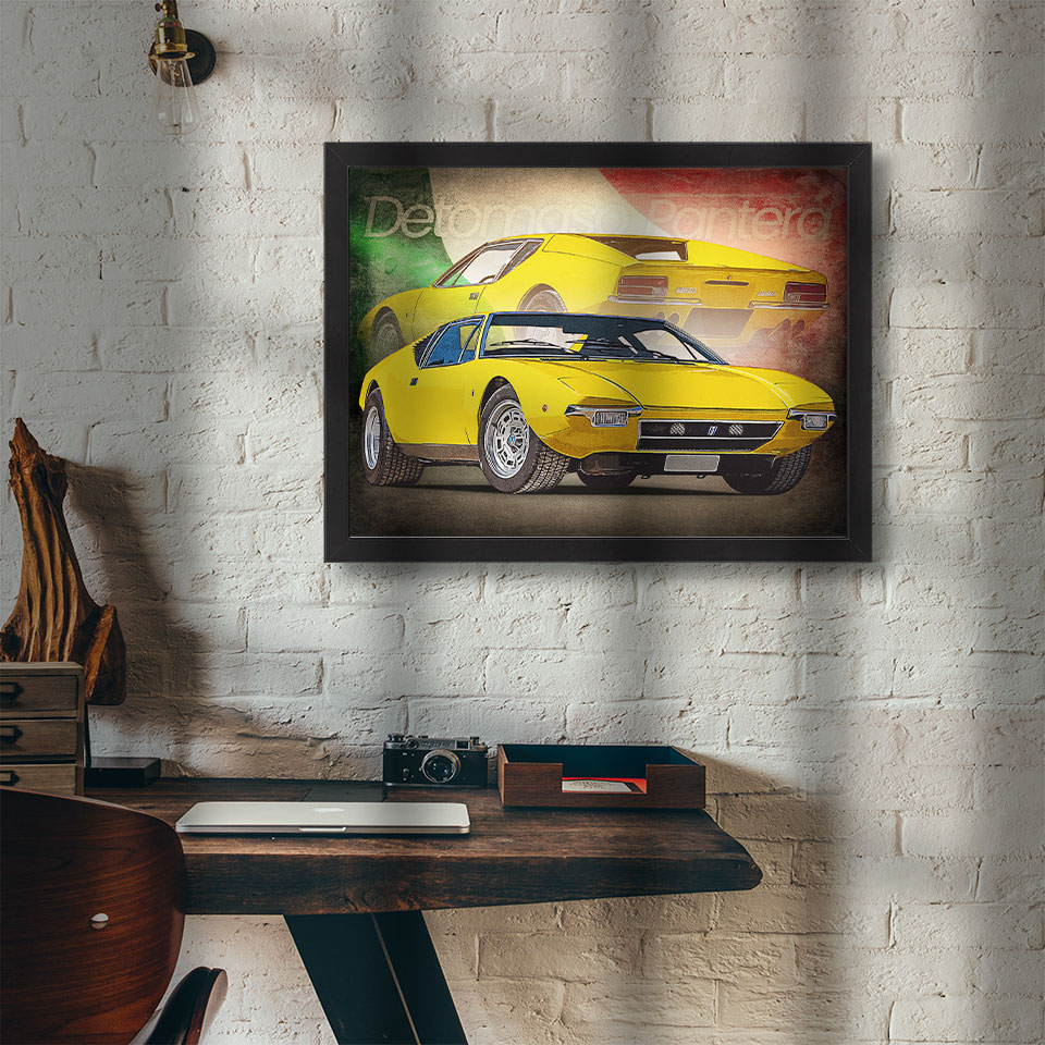 Obraz z naszą autorską grafiką w stylu retro, przedstawiający klasyczny samochód marki Detomaso Pantera