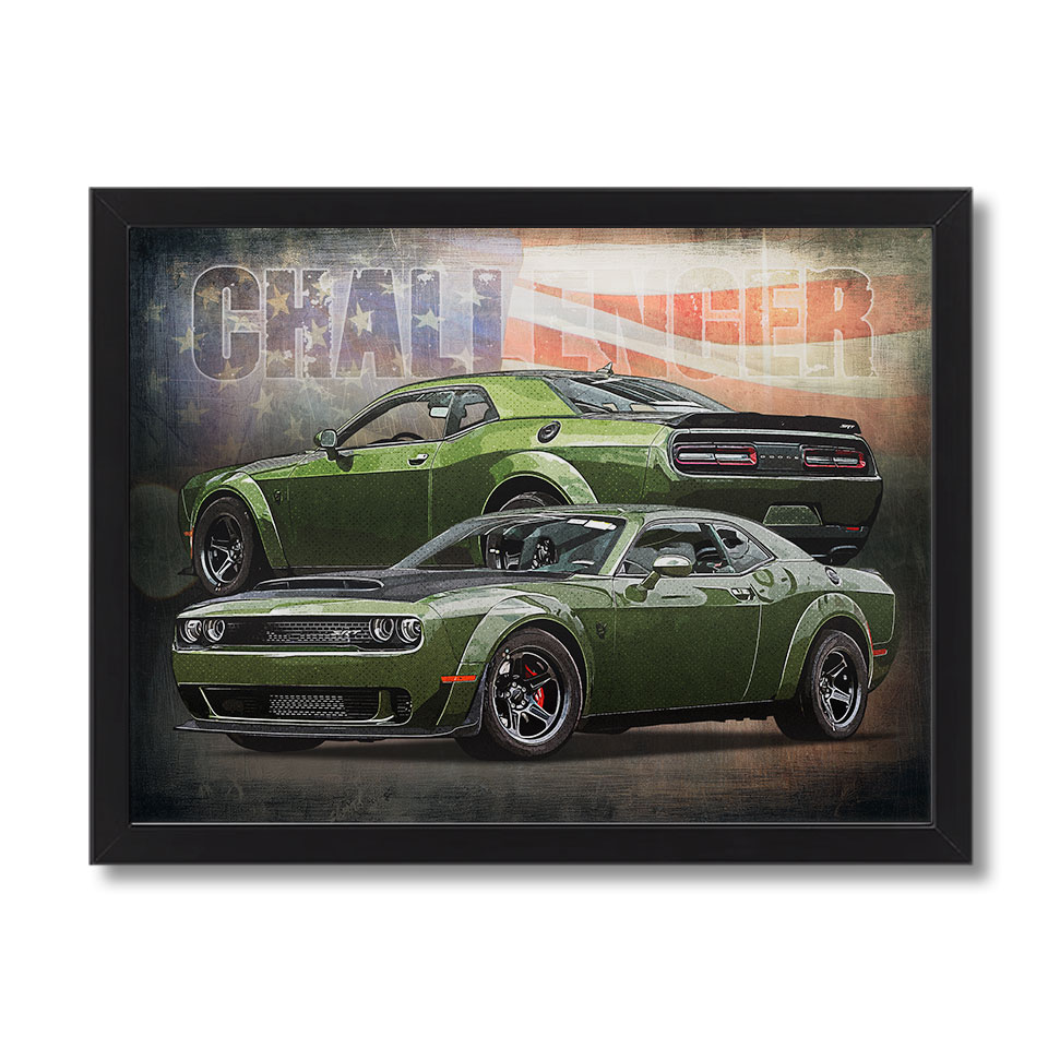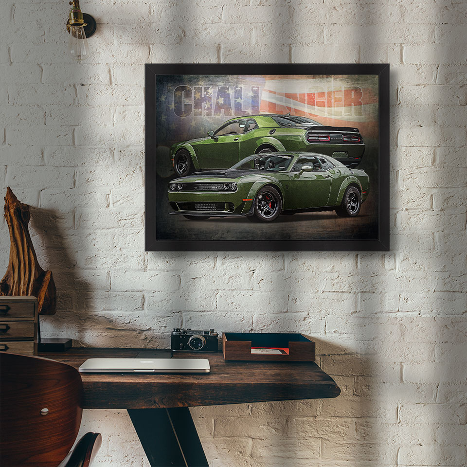 Obraz z naszą autorską grafiką w stylu retro, przedstawiający klasyczny samochód marki Dodge Challenger Demon