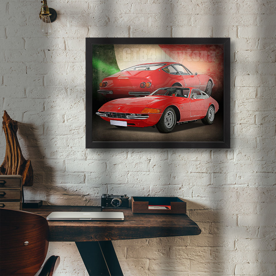 Obraz z naszą autorską grafiką w stylu retro, przedstawiający samochód marki Ferrari Daytona