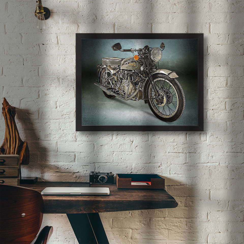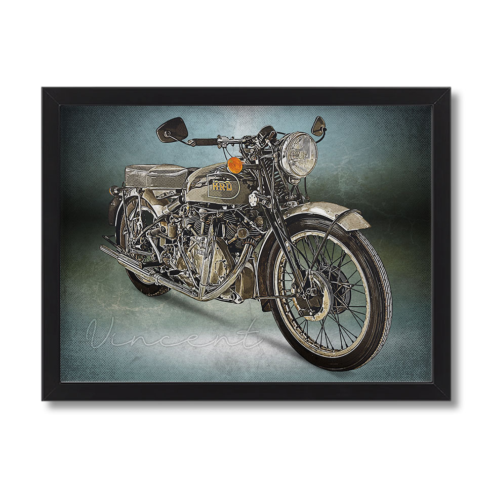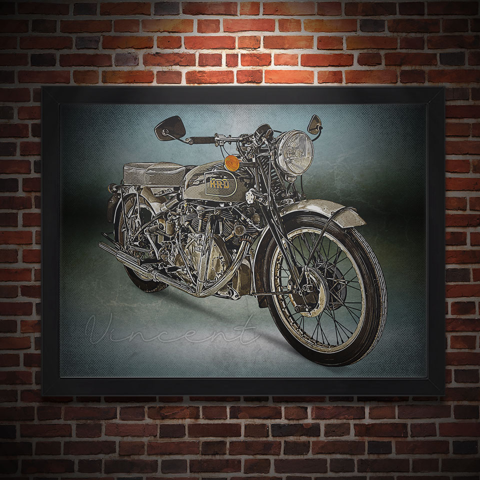 Obraz z naszą autorską grafiką w stylu retro, przedstawiający motocykl marki HRD Vincent.
