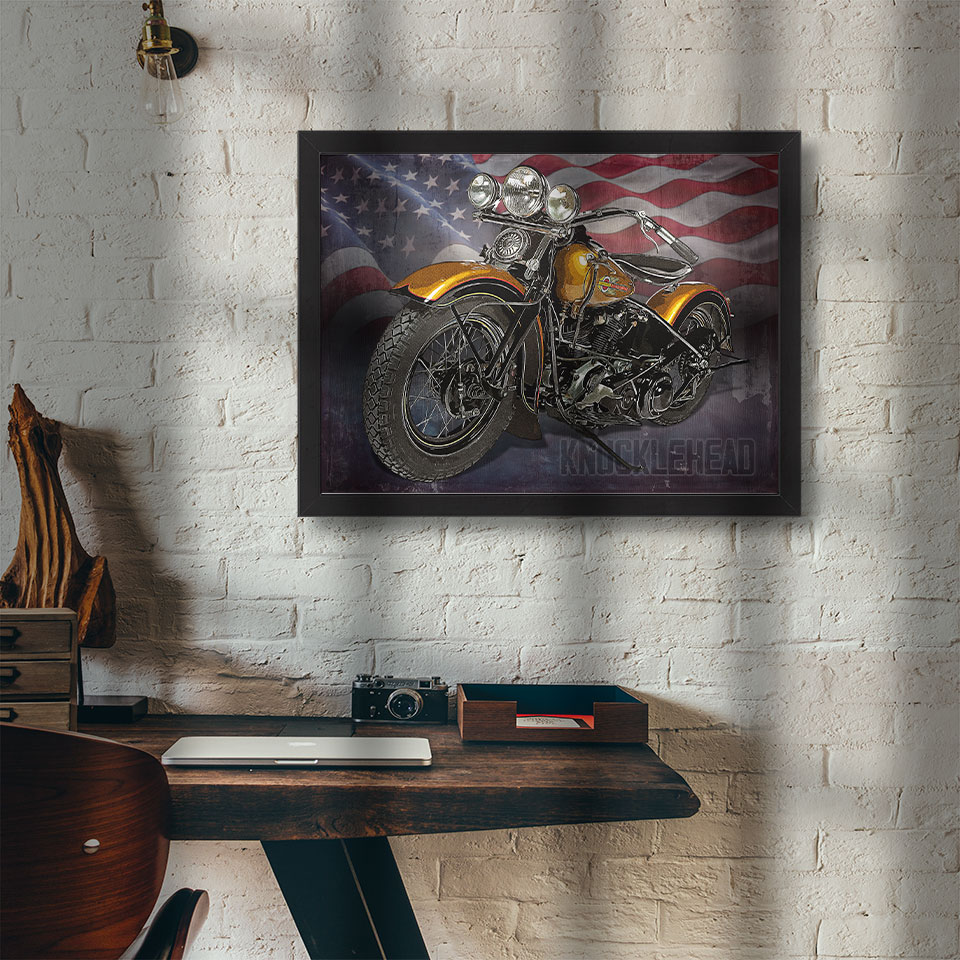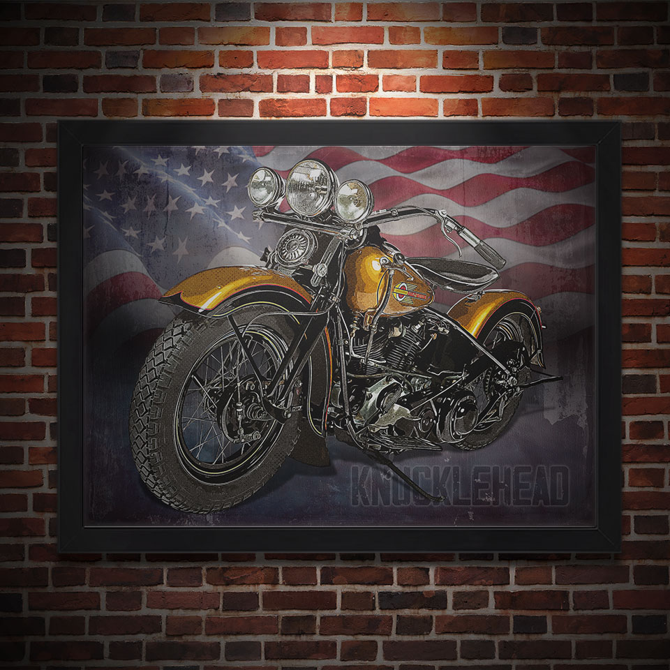 Obraz z naszą autorską grafiką w stylu retro, przedstawiający motocykl marki Harley Davidson Knucklehead.