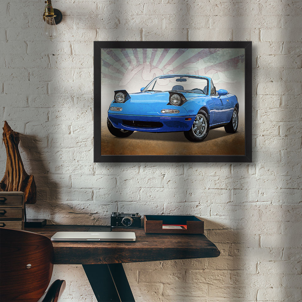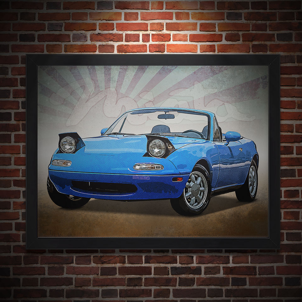 Obraz z naszą autorską grafiką w stylu retro, przedstawiający samochód marki Mazda MX5 Miata Cabrio