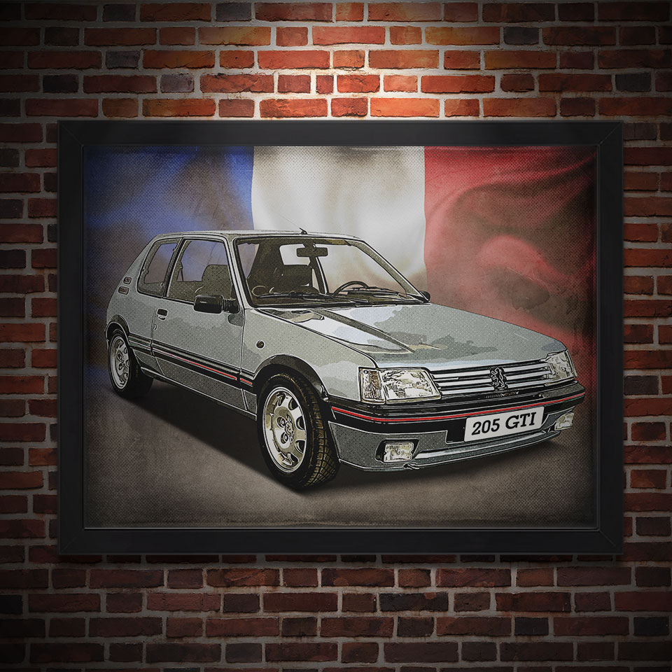 Obraz z naszą autorską grafiką w stylu retro, przedstawiający klasyczny samochód marki Peugeot 205 GTI