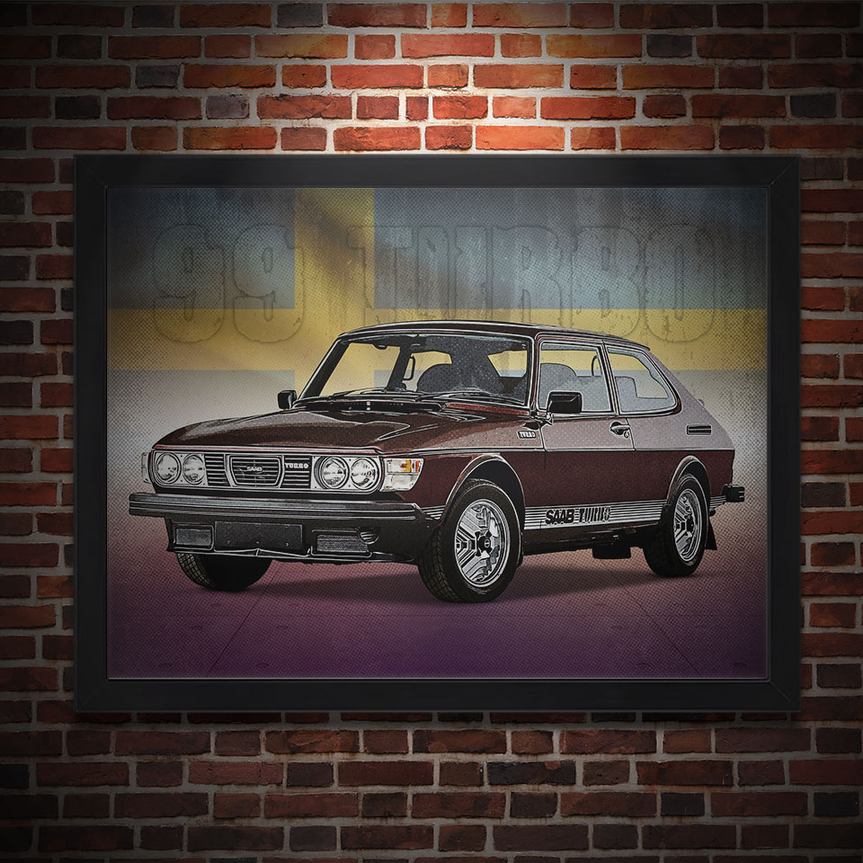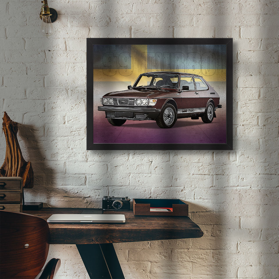 Obraz z naszą autorską grafiką w stylu retro, przedstawiający samochód marki Saab 99 Turbo.