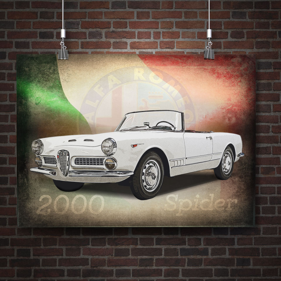 Plakat z naszą autorską grafiką w stylu retro, przedstawiający klasyczny samochód marki Alfa Romeo 2000 Spider