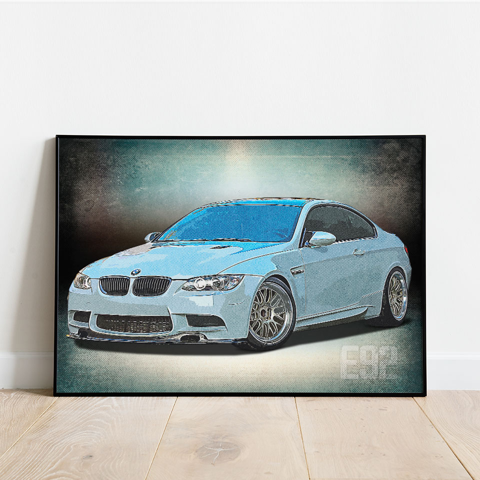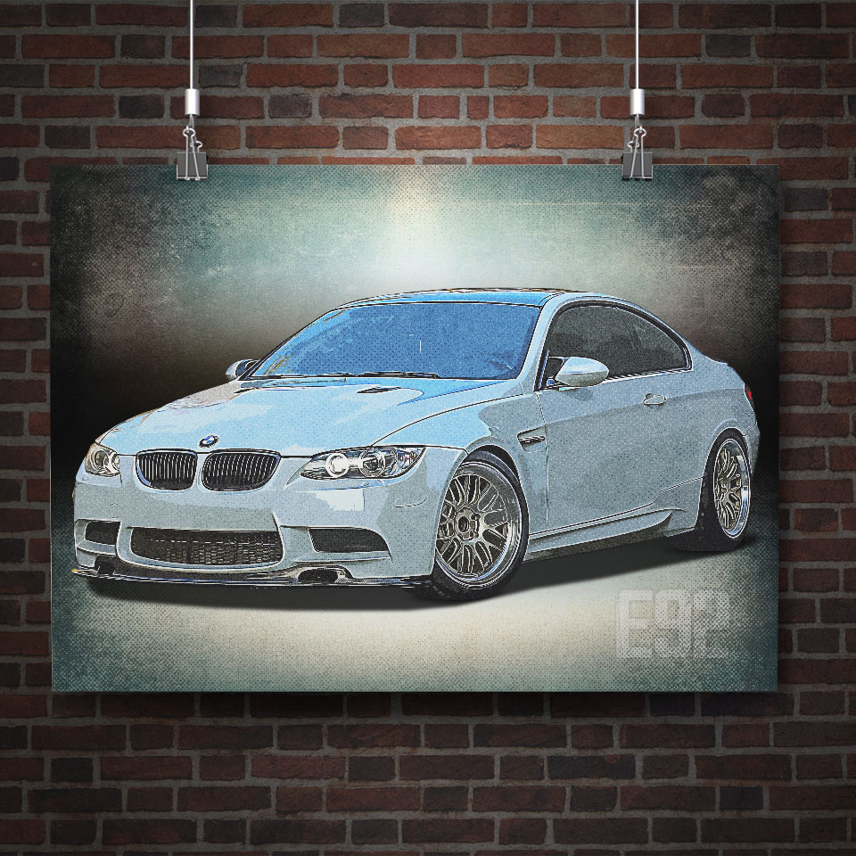Plakat z naszą autorską grafiką w stylu retro, przedstawiający samochód BMW E92