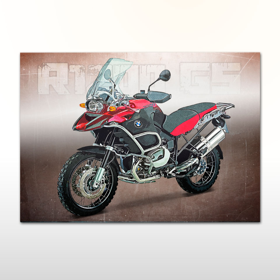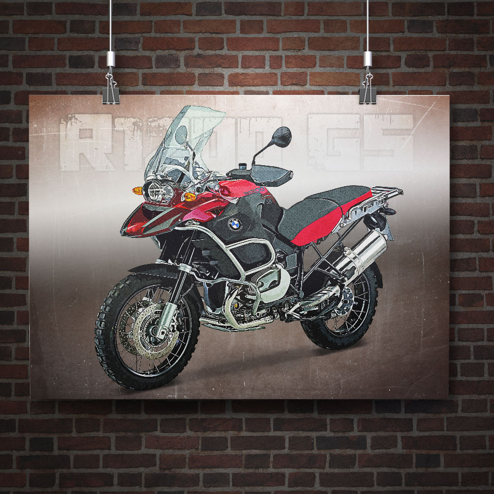 Plakat z naszą autorską grafiką w stylu retro, przedstawiający motocykl marki BMW R1200 GS