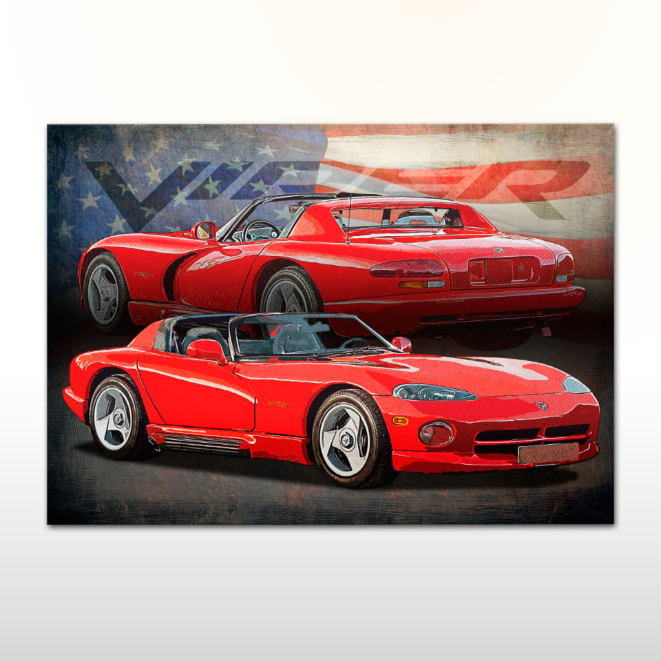 Plakat z naszą autorską grafiką w stylu retro, przedstawiający samochód marki Dodge Viper