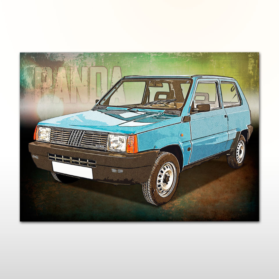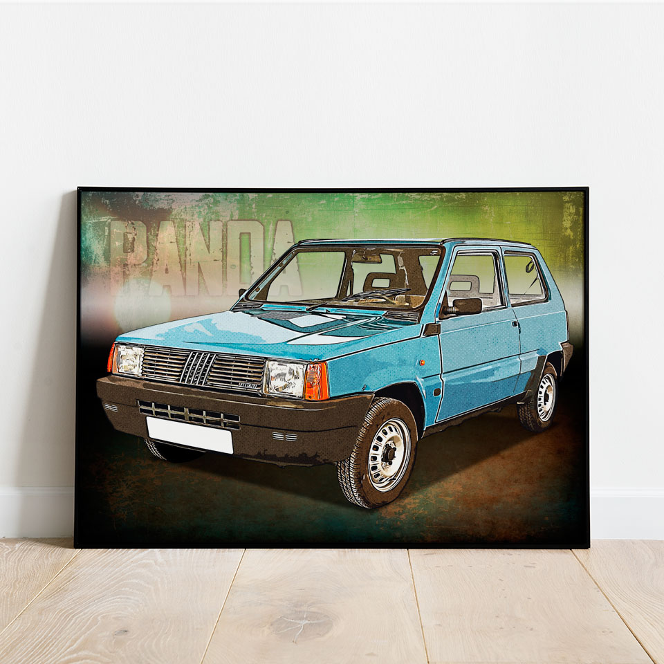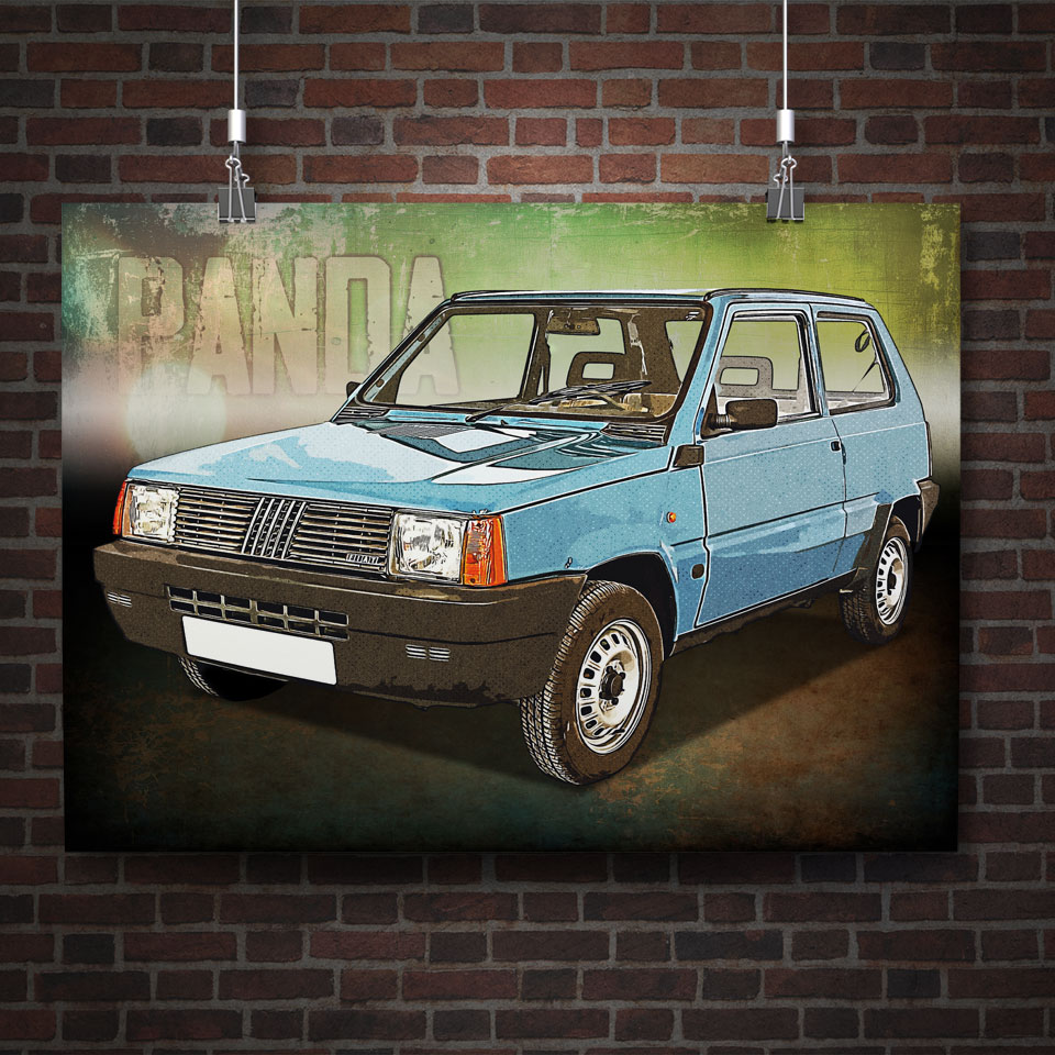 Plakat z naszą autorską grafiką w stylu retro, przedstawiający samochód Fiat Panda