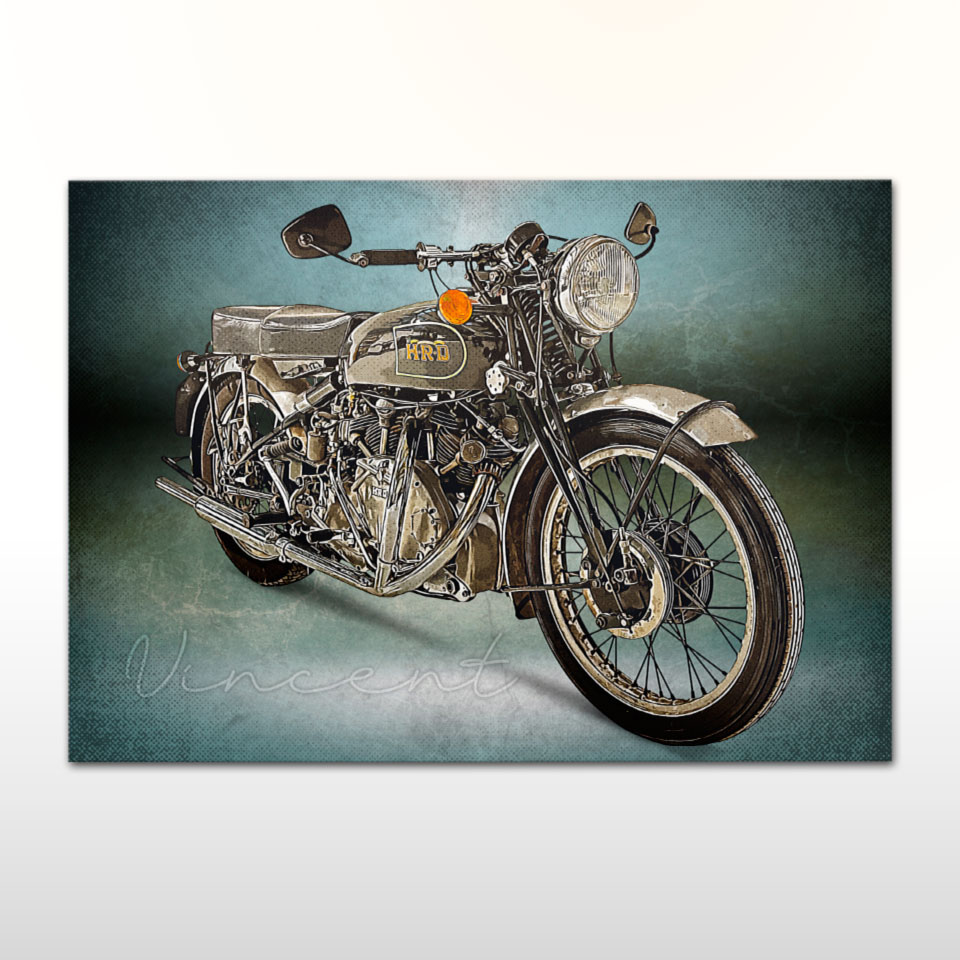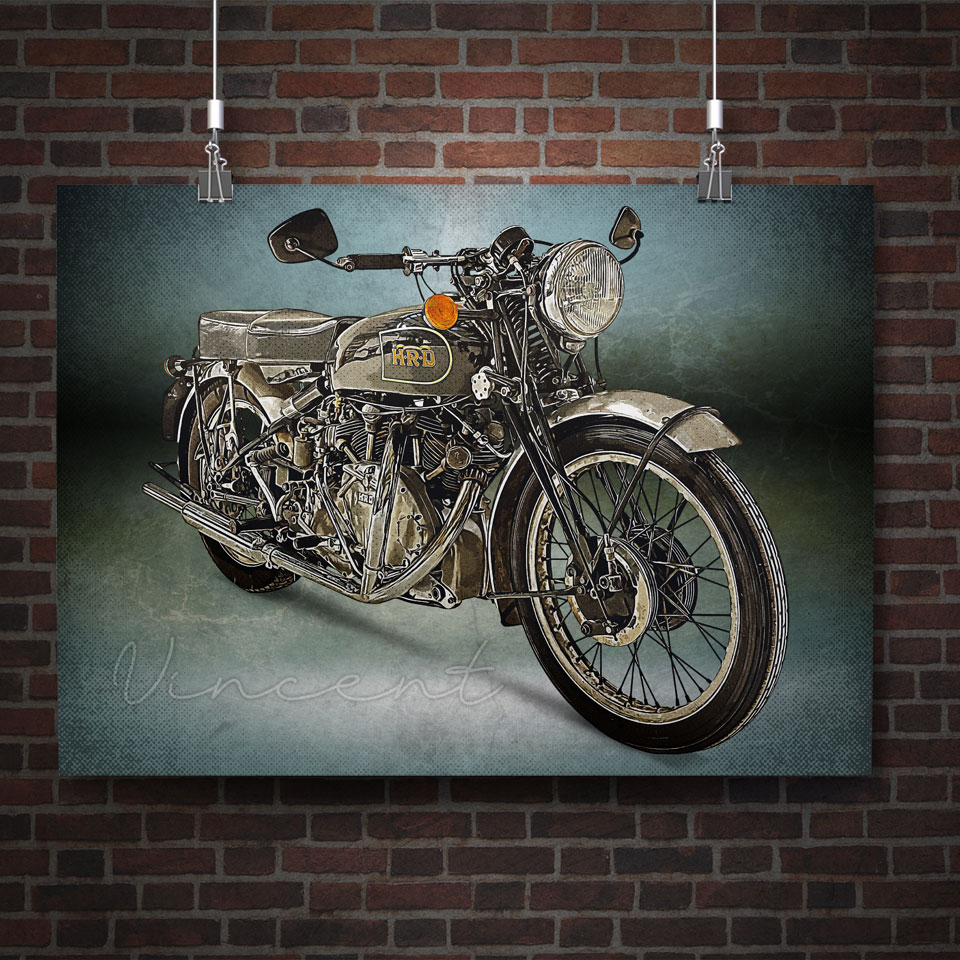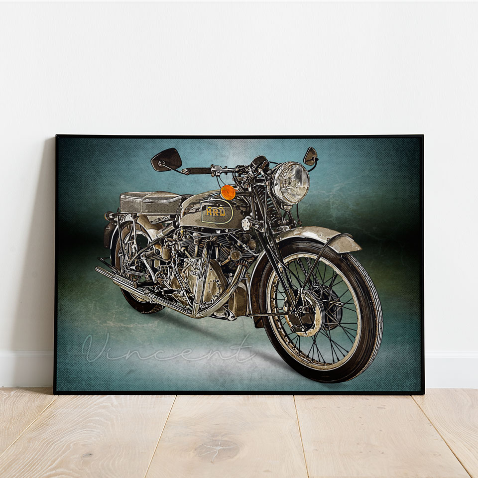Plakat z naszą autorską grafiką w stylu retro, przedstawiający motocykl marki HRD Vincent 1000