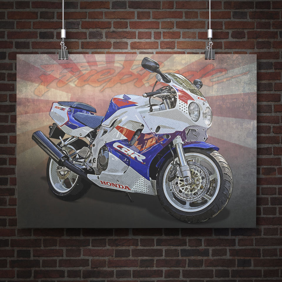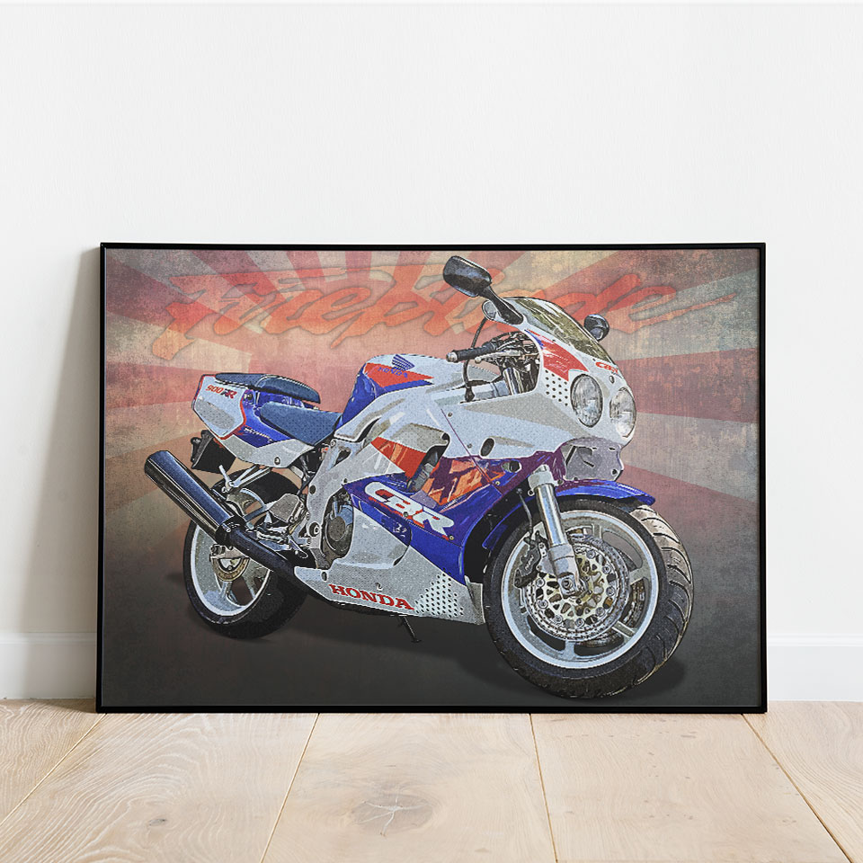 Plakat z naszą autorską grafiką w stylu retro, przedstawiający motocykl marki Honda CBR 900 SC28 Fireblade