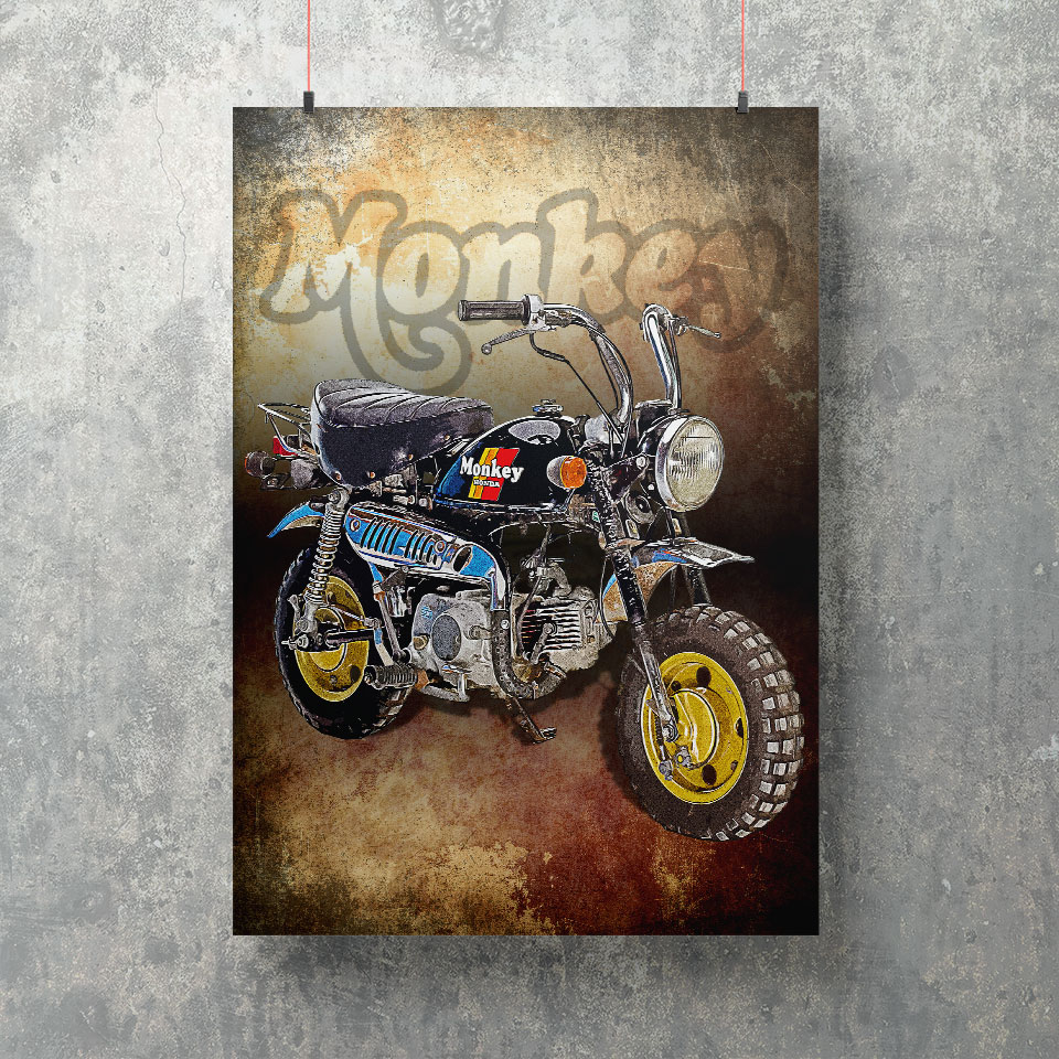 Plakat z naszą autorską grafiką w stylu retro, przedstawiający motocykl marki Honda Monkey