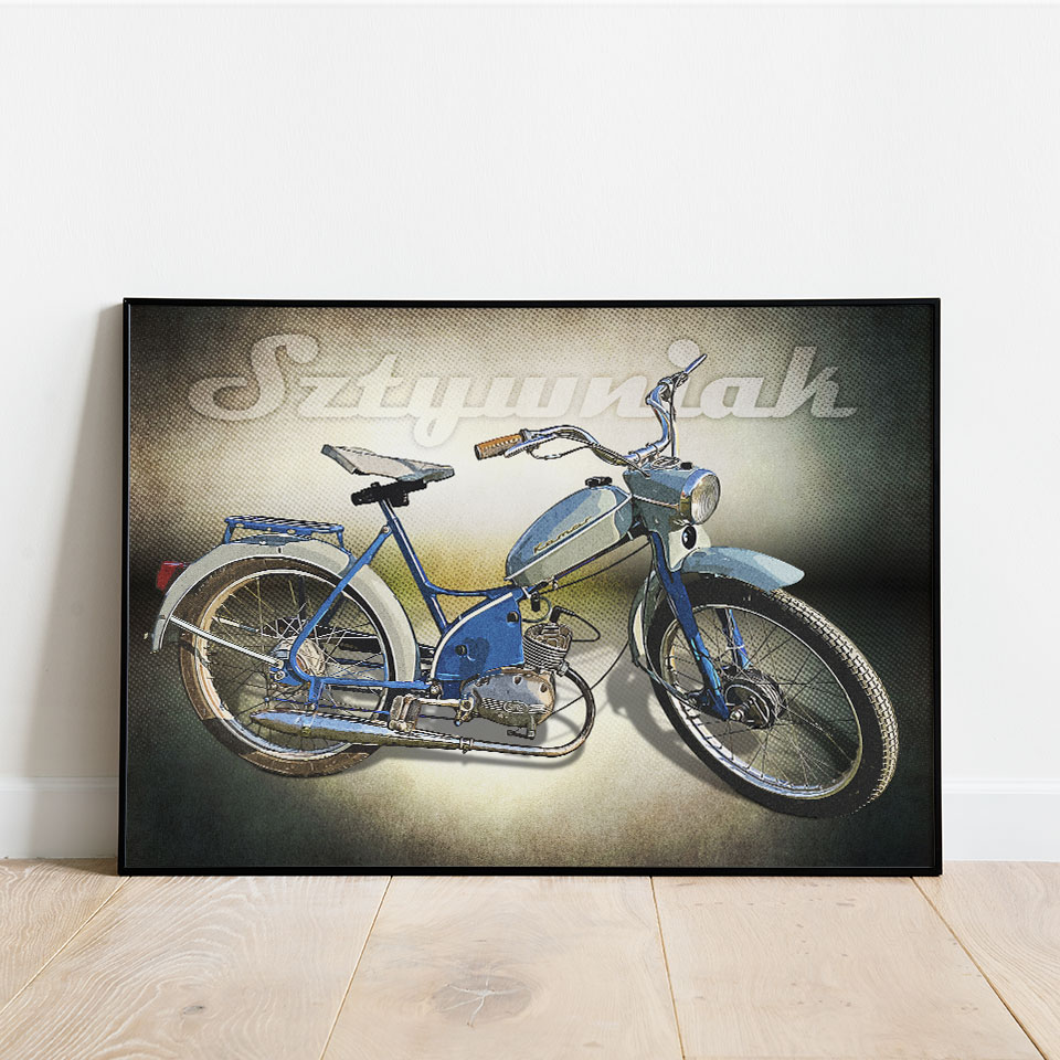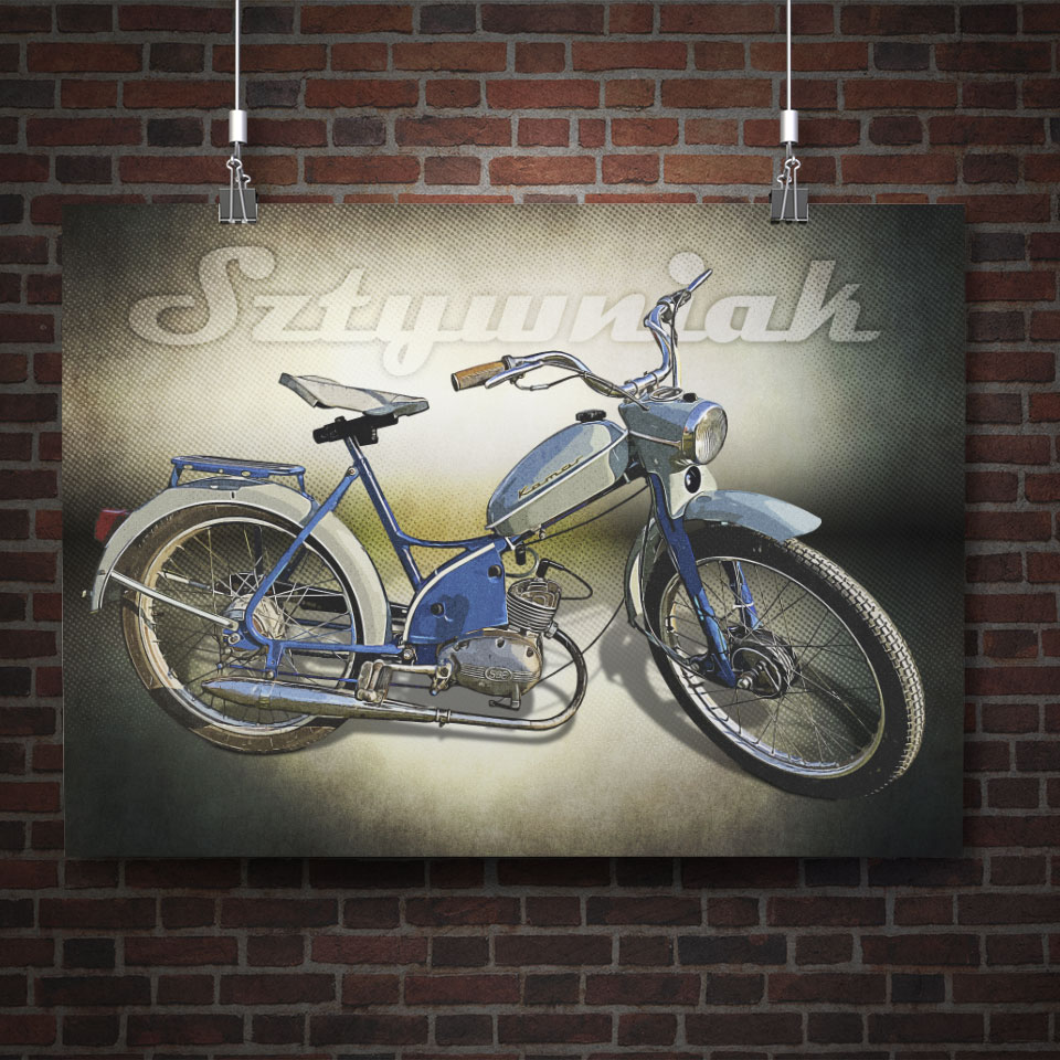 Plakat z naszą autorską grafiką w stylu retro, przedstawiający motorower Komar "Sztywniak"