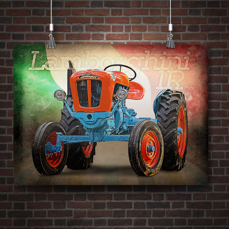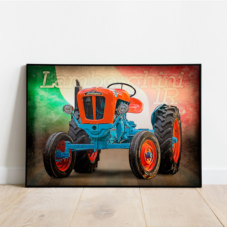 Plakat z naszą autorską grafiką w stylu retro, przedstawiający traktor marki Lamborghini 1R Idealna dekoracja ściany w warsztacie, garażu czy męskim azylu. Wydruk najwyższej jakości wykonany na papierze fotograficznym o gramaturze 200g. Plakat sprzedawany bez ramy. Wysyłamy zapakowany bezpiecznie w kartonową tubę.