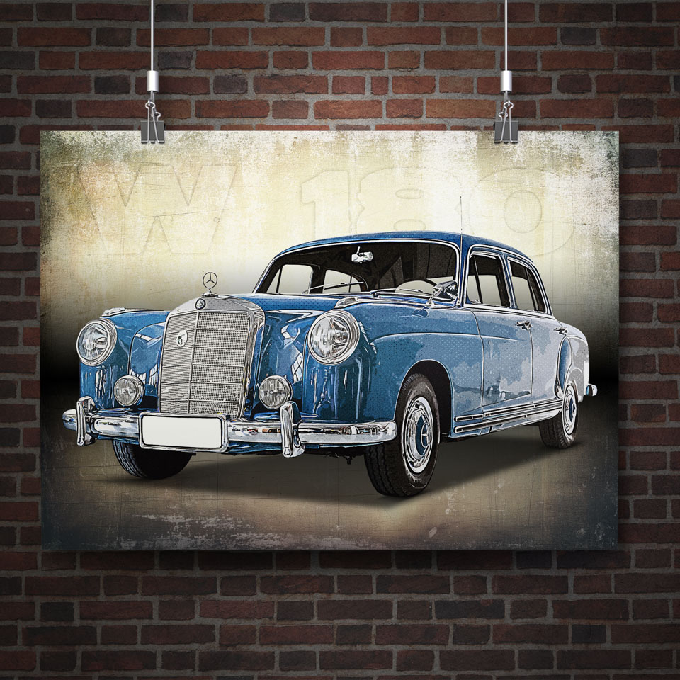 Plakat z naszą autorską grafiką w stylu retro, przedstawiający samochód marki Mercedes W180