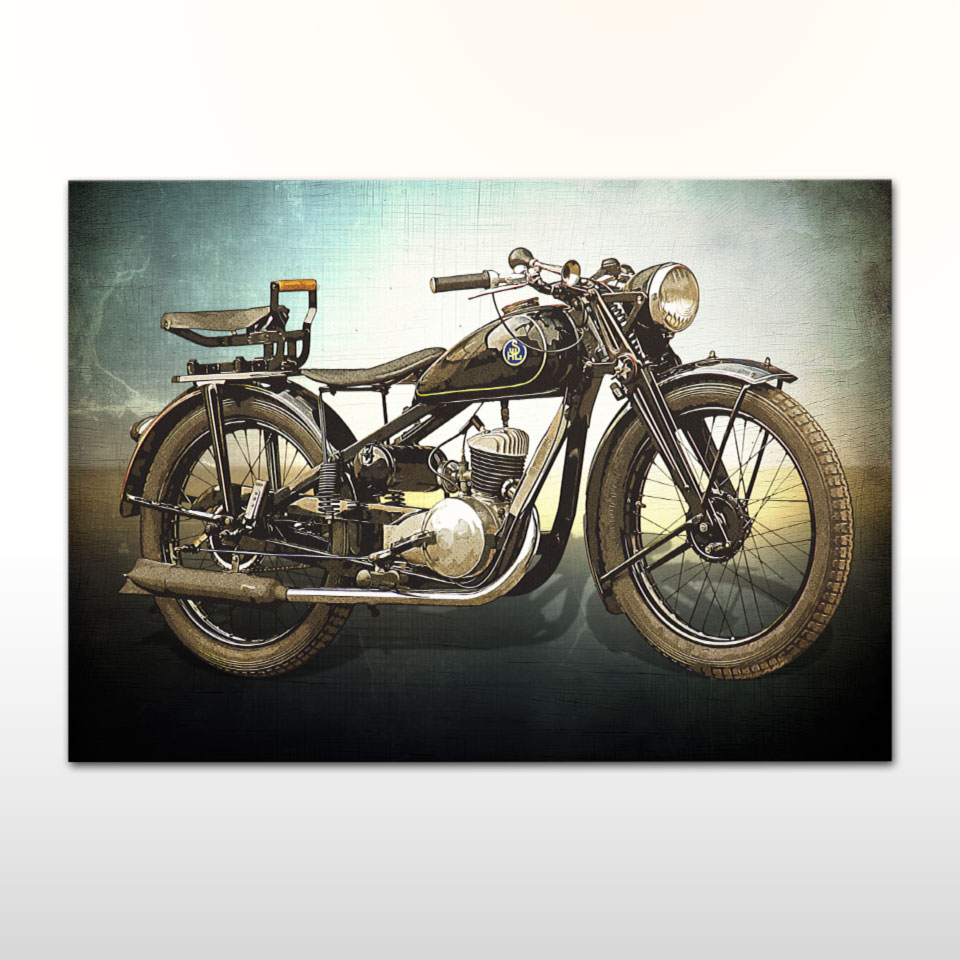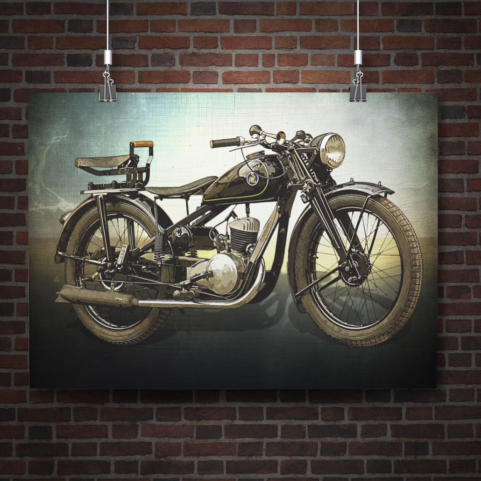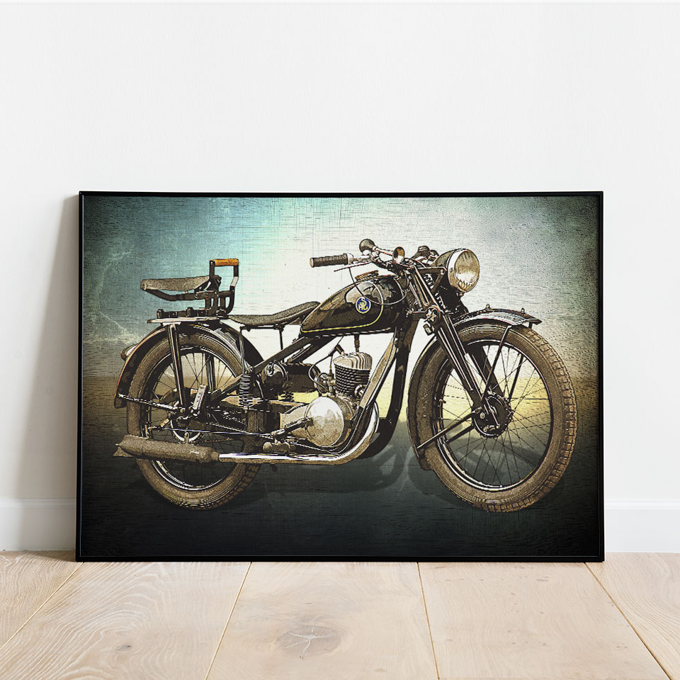 Plakat z naszą autorską grafiką w stylu retro, przedstawiający motocykl SHL M04