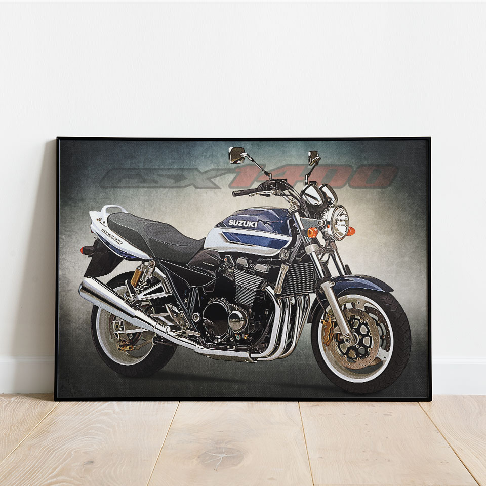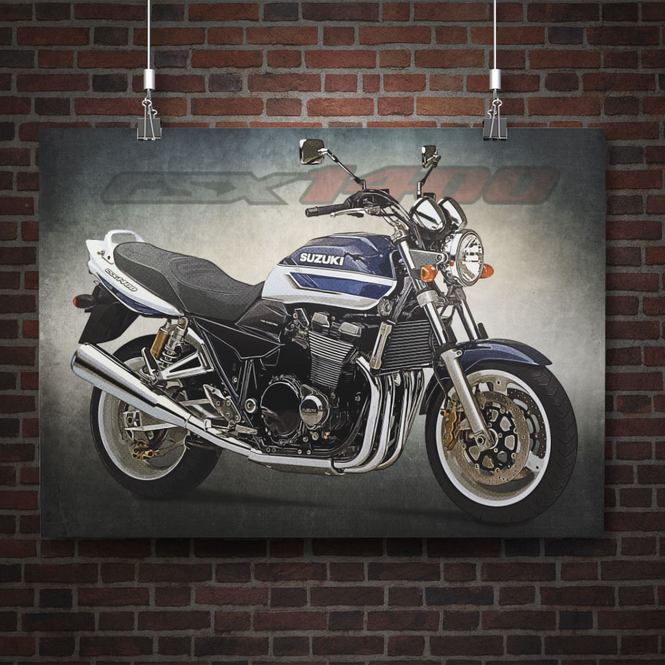 Plakat z naszą autorską grafiką w stylu retro, przedstawiający motocykl marki Suzuki GSX1400