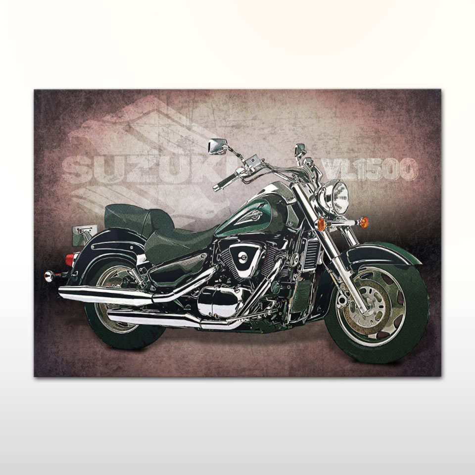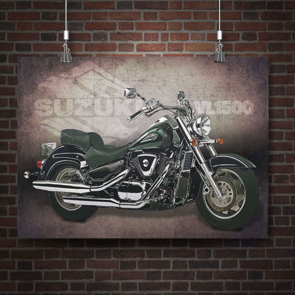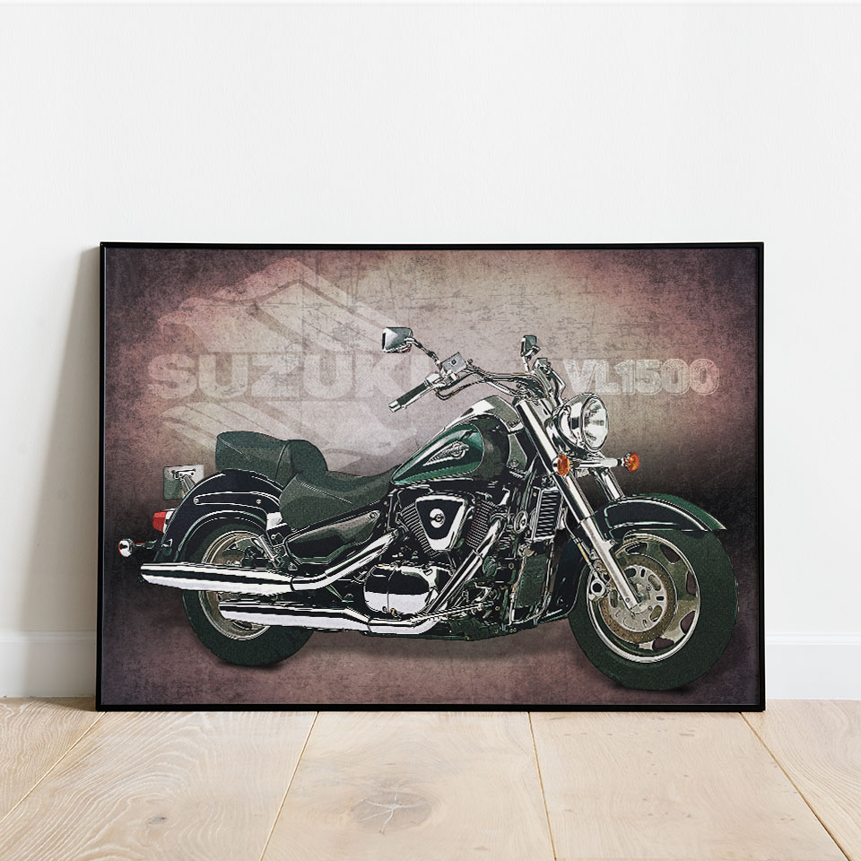 Plakat z naszą autorską grafiką w stylu retro, przedstawiający motocykl Suzuki Intruder VL1500