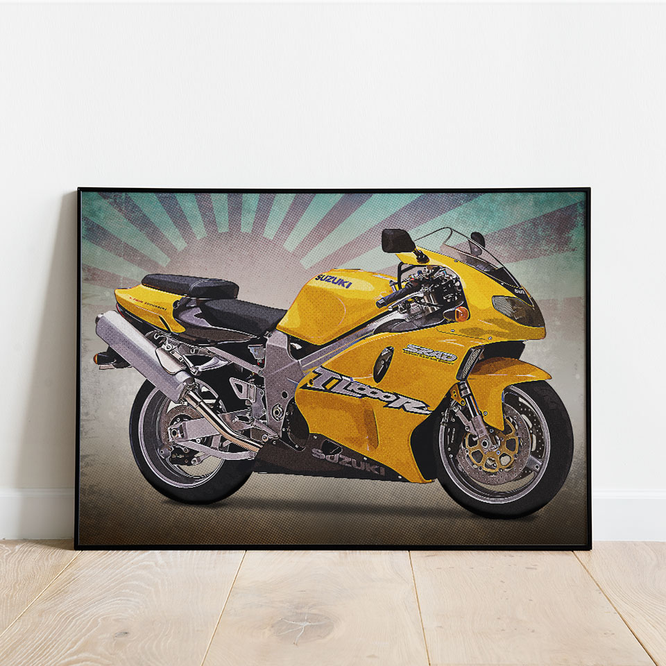 Plakat z naszą autorską grafiką w stylu retro, przedstawiający motocykl marki Suzuki GSX TL1000