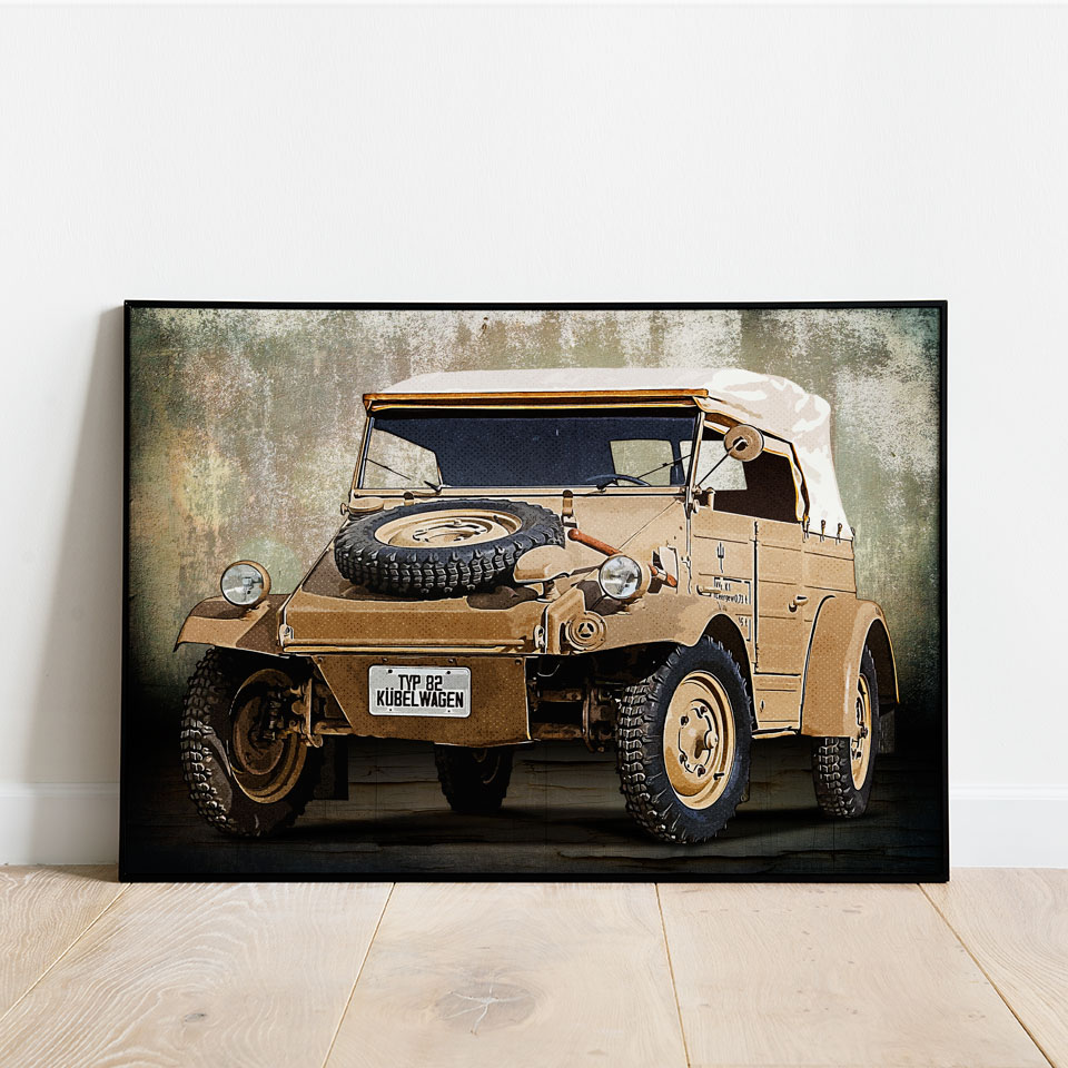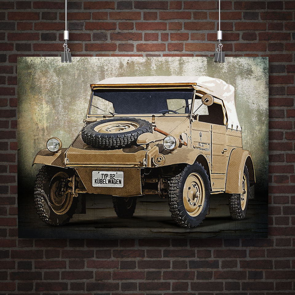 Plakat z naszą autorską grafiką w stylu retro, przedstawiający samochód marki Volkswagen Typ 82 zwanego także Kubelwagenem