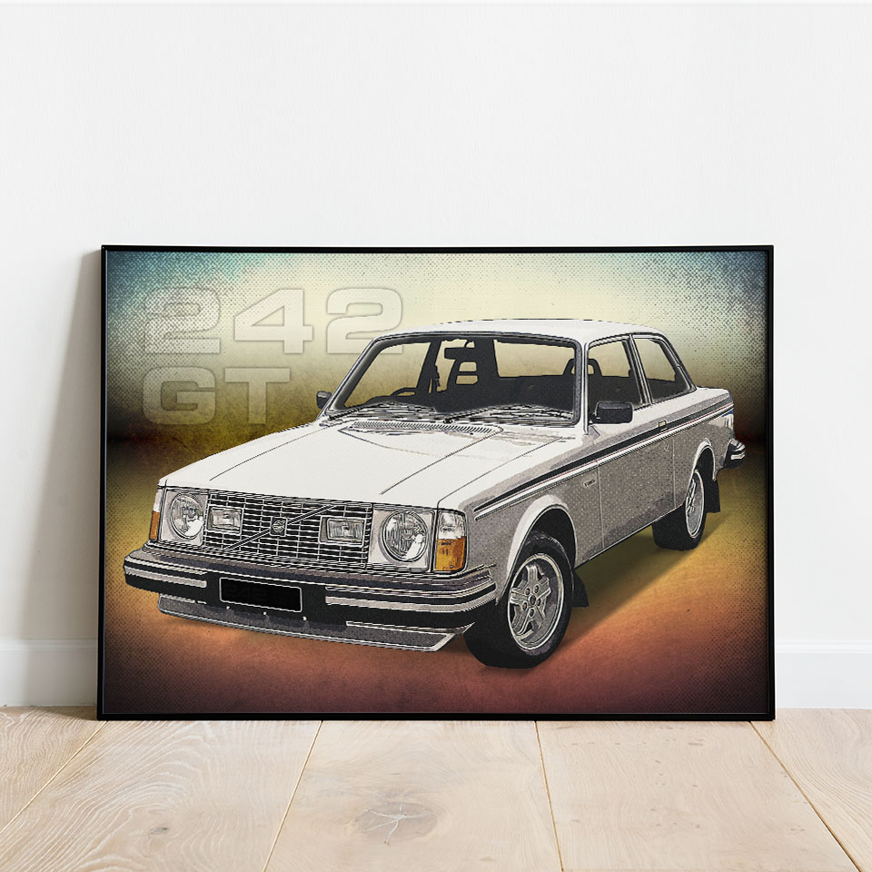 Plakat z naszą autorską grafiką w stylu retro, przedstawiający samochód Volvo 242 GT.