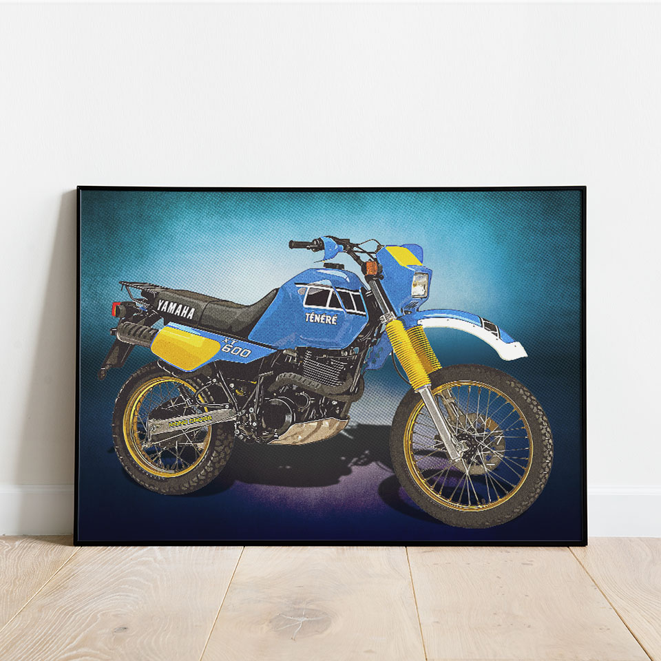 Plakat z naszą autorską grafiką w stylu retro, przedstawiający motocykl Yamaha XT600 Tenere