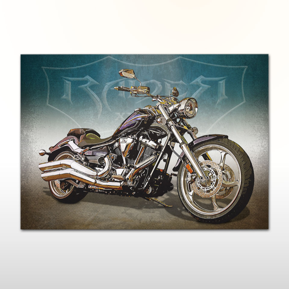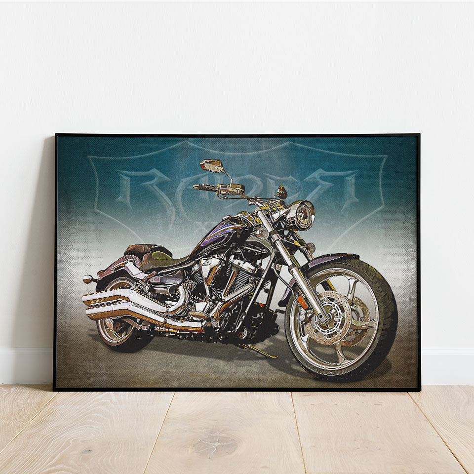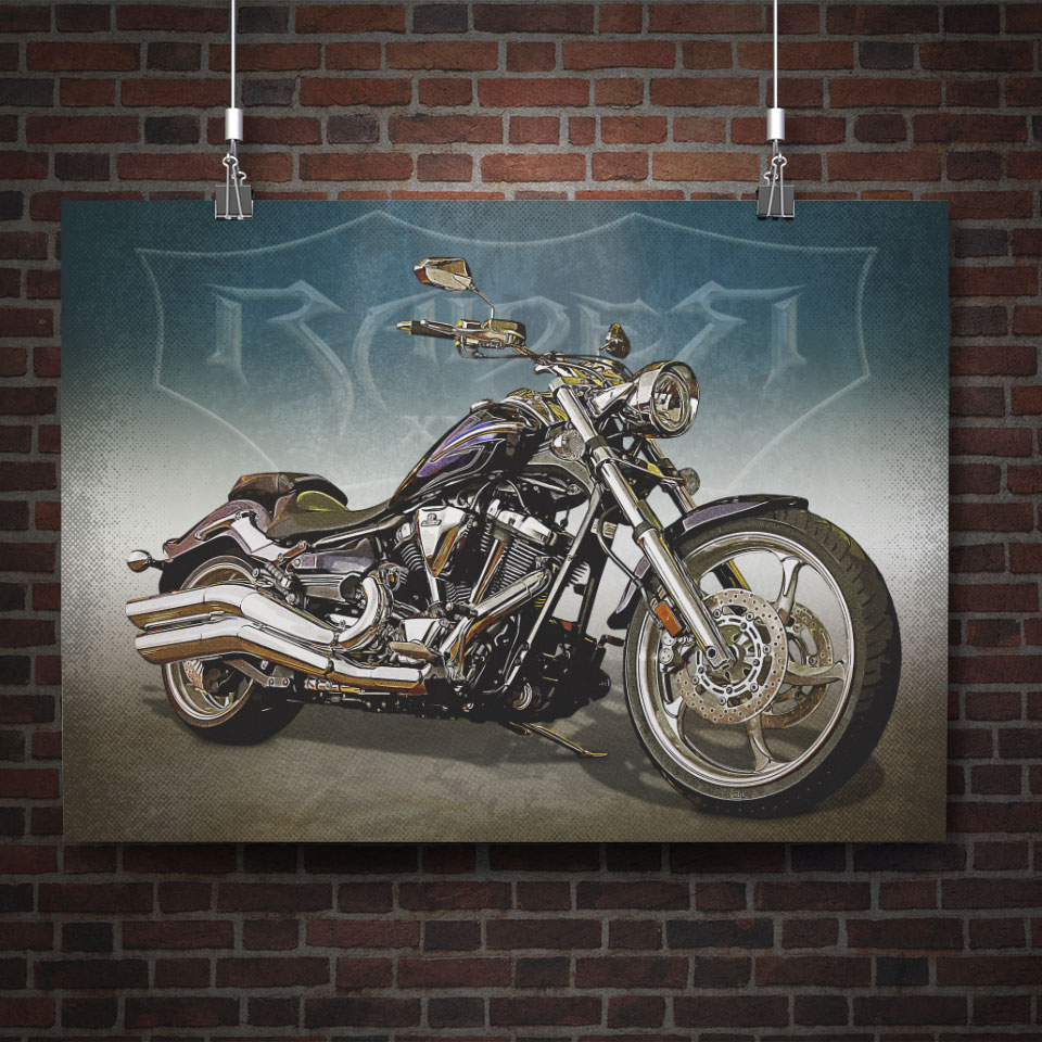 Plakat z naszą autorską grafiką w stylu retro, przedstawiający motocykl Yamaha XV1900 Raider