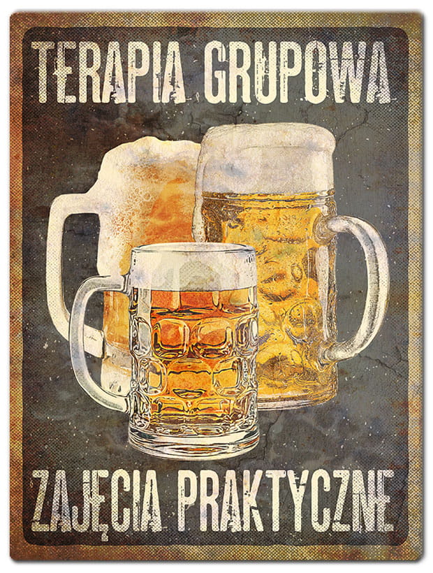 Tabliczka dekoracyjna zaprojektowana w stylu retro. Utrzymana w klimacie PRL. Grafika przedstawia ilustrację dwóch kufli złocistego płynu i tekst "Terapia grupowa. Zajęcia praktyczne".